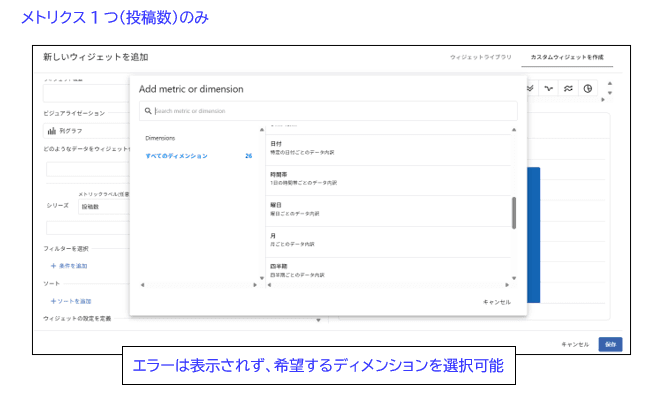 シリーズを追加をクリックし、メトリクス:投稿数を選択>X軸を追加をクリックし、日付を選択します。このとき、設定可能な26つのディメンションが表示され、エラーは出ません。日付は、投稿数と互換性があるディメンションということになります。