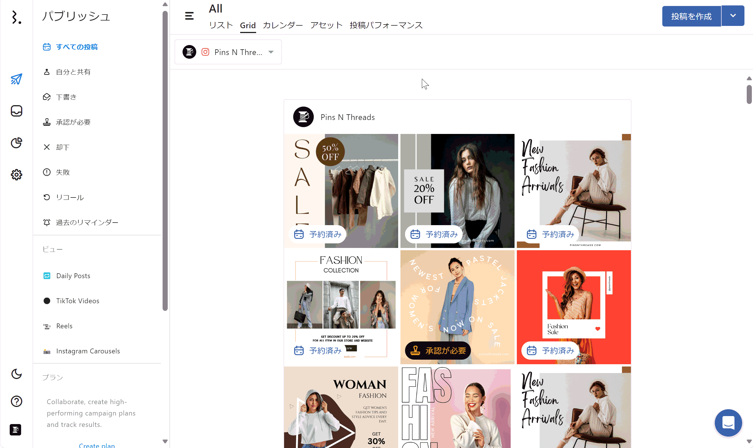 Statusbrewのグリッドビューでは、Statusbrewに接続済みのInstagramアカウントのプロファイルレイアウトを確認することができます。グリッドは、予約プランナー内にあります。グリッド(Grid)ビューを開くと、過去180日分の公開済みの投稿から、未公開で予約済みの投稿まで、Instagramプロファイルを再現した画面が表示されます。この画面から簡単に公開前の投稿を並び替えて、オーディエンスを惹きつける魅力的なフィードを設計することができます。