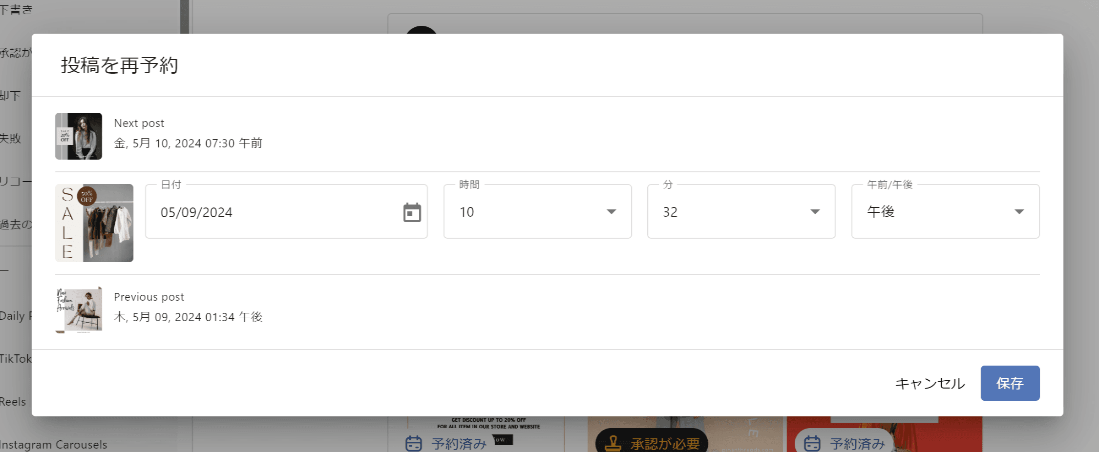 投稿の再予約画面が表示されます。前後の投稿の日時内で、ご希望の日時を選択します。