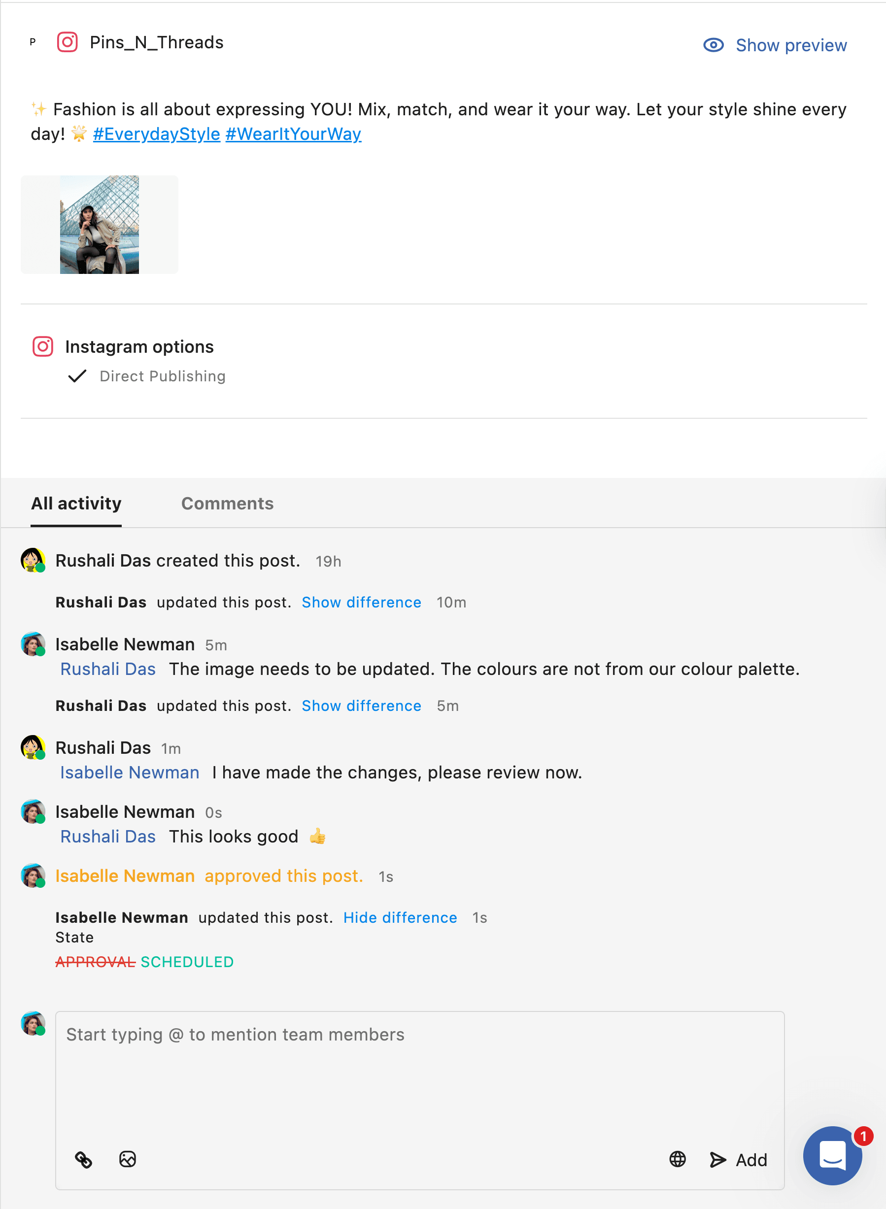 各投稿をクリックして編集、承認、チームとの共同作業が可能