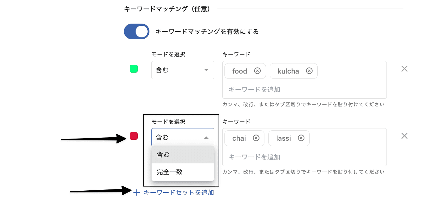 キーワードマッチング セクションで、検出したい単語を入力します。