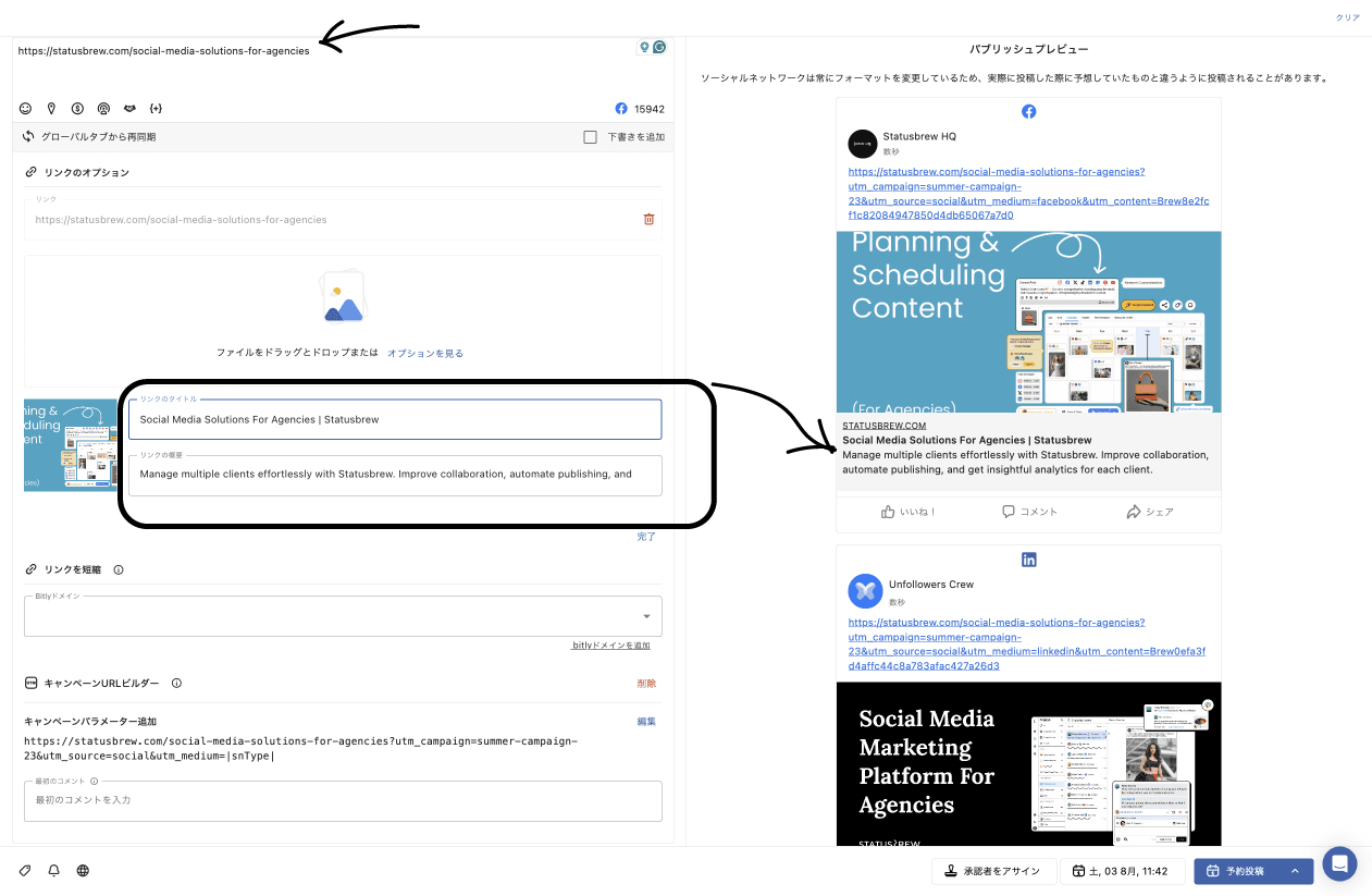 URLメタデータは、投稿内のウェブサイトに関する追加情報を提供します。Statusbrewでは、入力されたリンクから収集されたメタデータをプレビューおよび編集してカスタマイズすることができます。