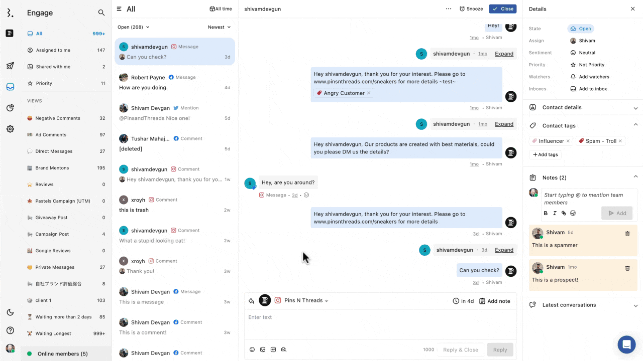 ソーシャル上のブランド評判管理のためのコメント監視は、マーケティング手法の一つでもあり非常に重要です。企業では複数人体制でCSチームを配置し、ユーザー(顧客)からの問い合わせやソーシャルメディアのコメント、DMを管理していることでしょう。チームメンバーが現在アクティブな人数=勤務状態を把握していれば、彼らの1チケットにかかる時間等の作業能力を正確に評価し、効果的に運営することができます。同様に、マネージャーやチームリーダーも、チームメンバーの利用可能性に応じて会話を割り当てることができます。