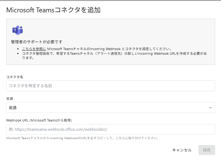 コネクタ名(任意)を入力、言語(英語/日本語)を選択し、Microsoft WorkflowsでコピーしたURLを貼り付け、保存をクリックします。