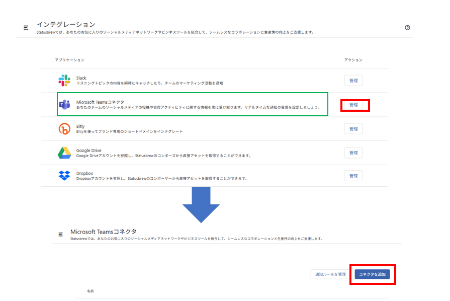 1. Teams側、2. Statusbrew側と2段階で設定が必要です。