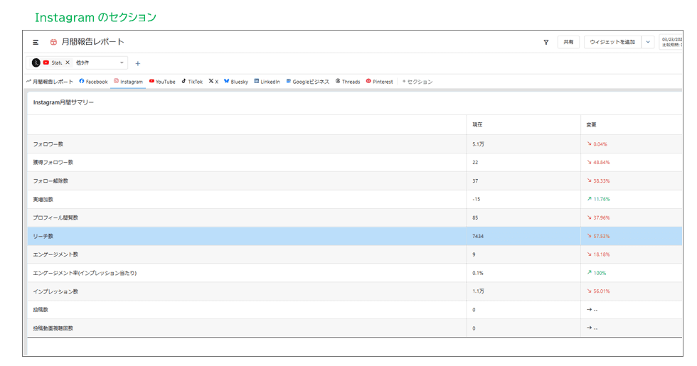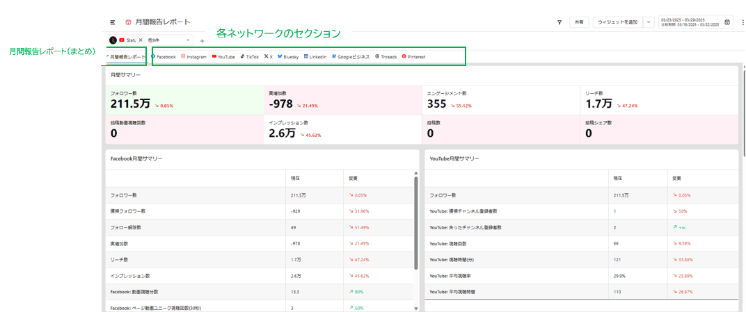 各ネットワークのサマリー:各ネットワークごとに、フォロワー数、エンゲージメント数などを表示。ネットワーク固有のメトリクスも確認することが可能です。