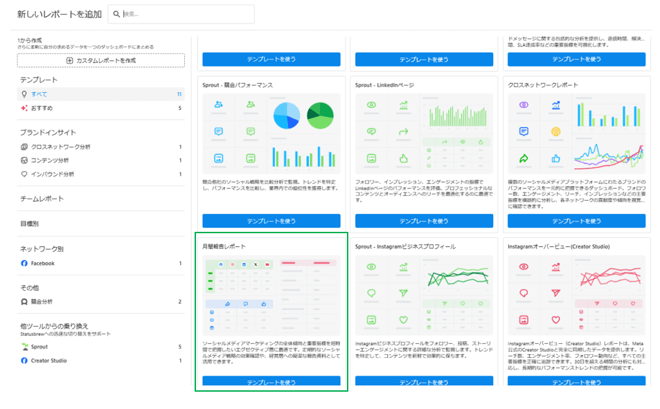 Statusbrewでは、様々な種類のテンプレートレポートをご用意しています。今回は基本的なパフォーマンスを月ごとに把握するための月間報告レポートをご紹介します。
