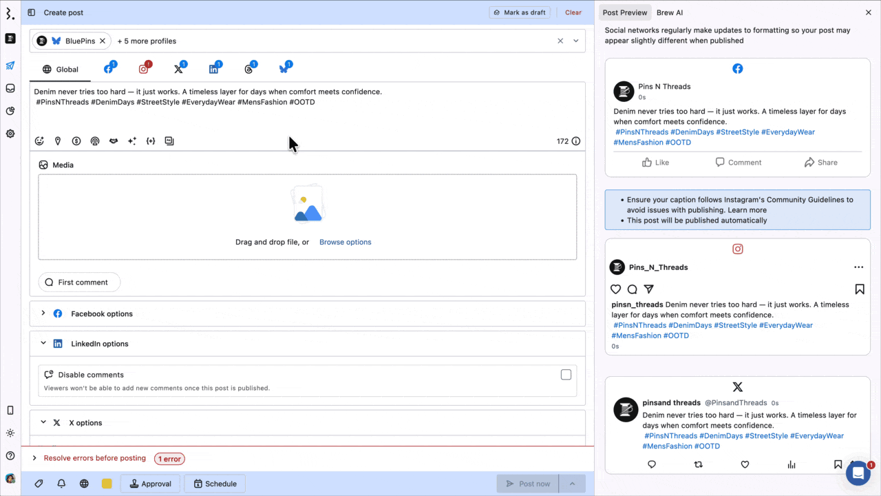 プロファイルピッカーから投稿先のネットワークを選択します。