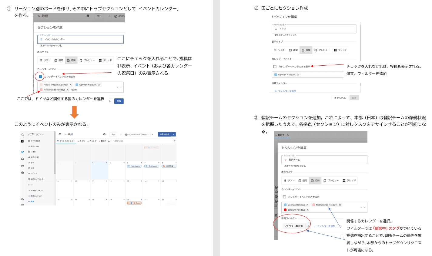 国ごとにセクションを作る(各国のカレンダーを選択。適宜フィルターを追加)