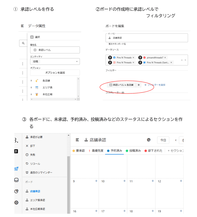 次に、各ボードの中を、要承認、投稿済みなどに分類します。これによって各レベルでの投稿(承認)履歴を確認できます。敢えて却下されたコンテンツのセクションも設けることで、却下される傾向が見つかり、改善につながるかもしれません。