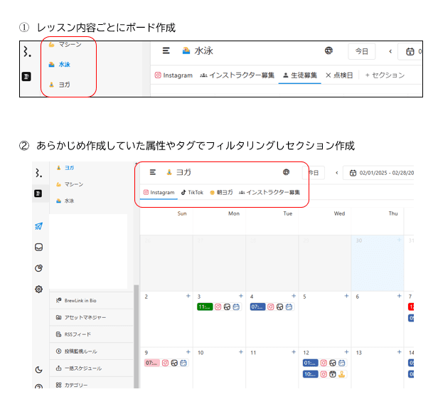 →レッスンごとにボードを整理することによって、「どのプラットフォーム向けに、どの種類のコンテンツ(写真?テキスト?)を作成すべきか」 「インストラクター募集に力をいれるのはどのレッスンか?」などが明確になります。