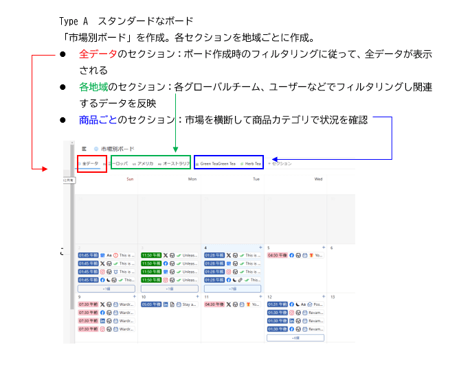 TypeA スタンダード:ボードは1つ。リージョン別にセクションを作るスタンダードな管理方法