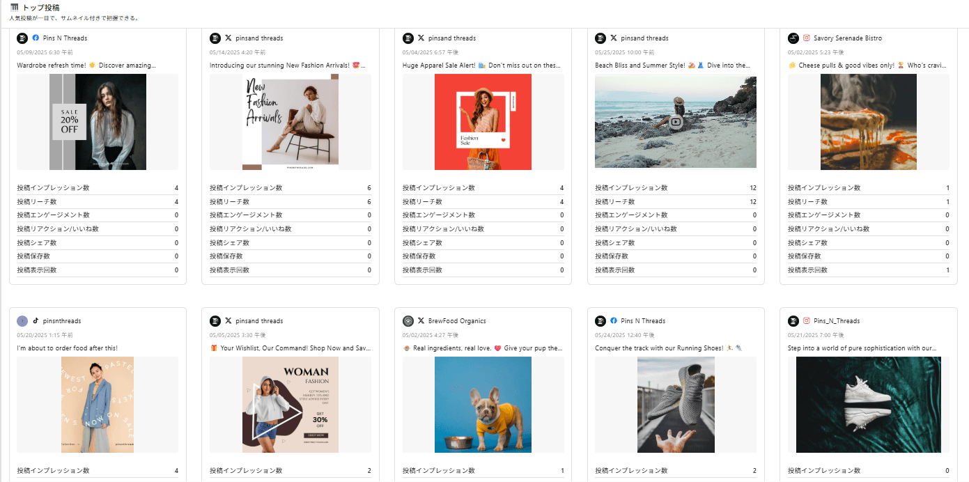 リーチ数やいいね数といった数値だけで表現するより、サムネイル付きの視覚的に分かりやすいレポートは、チームメンバーやクライアントとのシェアにも最適です。