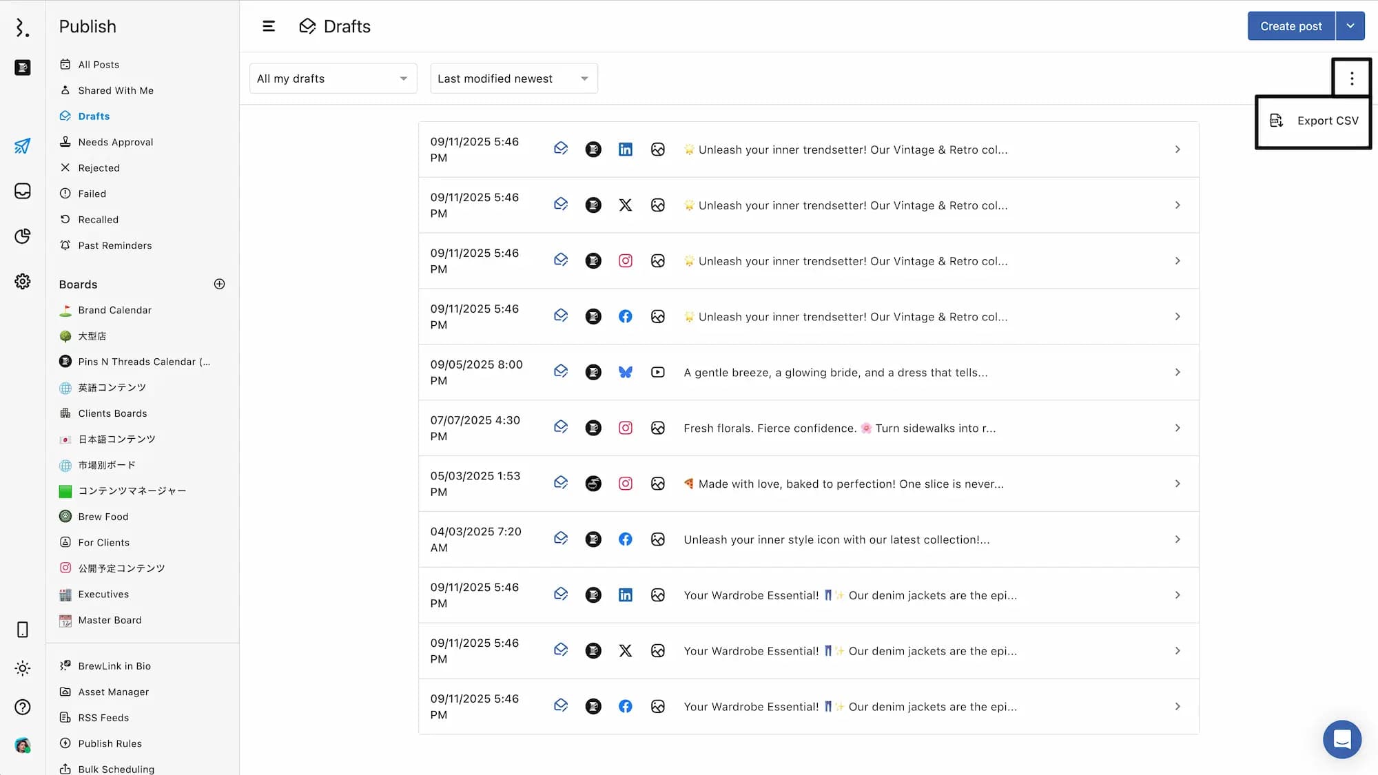 下書き投稿をエクスポートしたいときは、画面右上の三点メニュー をクリックし、 ECSV形式でエクスポートを選択します。
