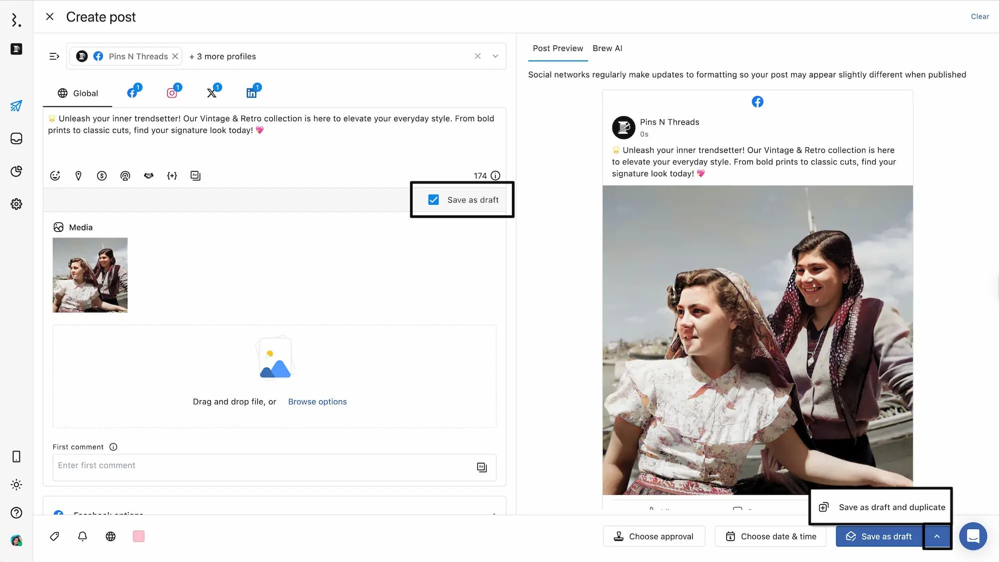 注意:下書きを追加の右にあるをクリックすると、 下書きと追加と複製というオプションが表示されます。オリジナルを保持したまま内容を修正したい時や、他のプロファイルのために複製したいときに便利なオプションです。