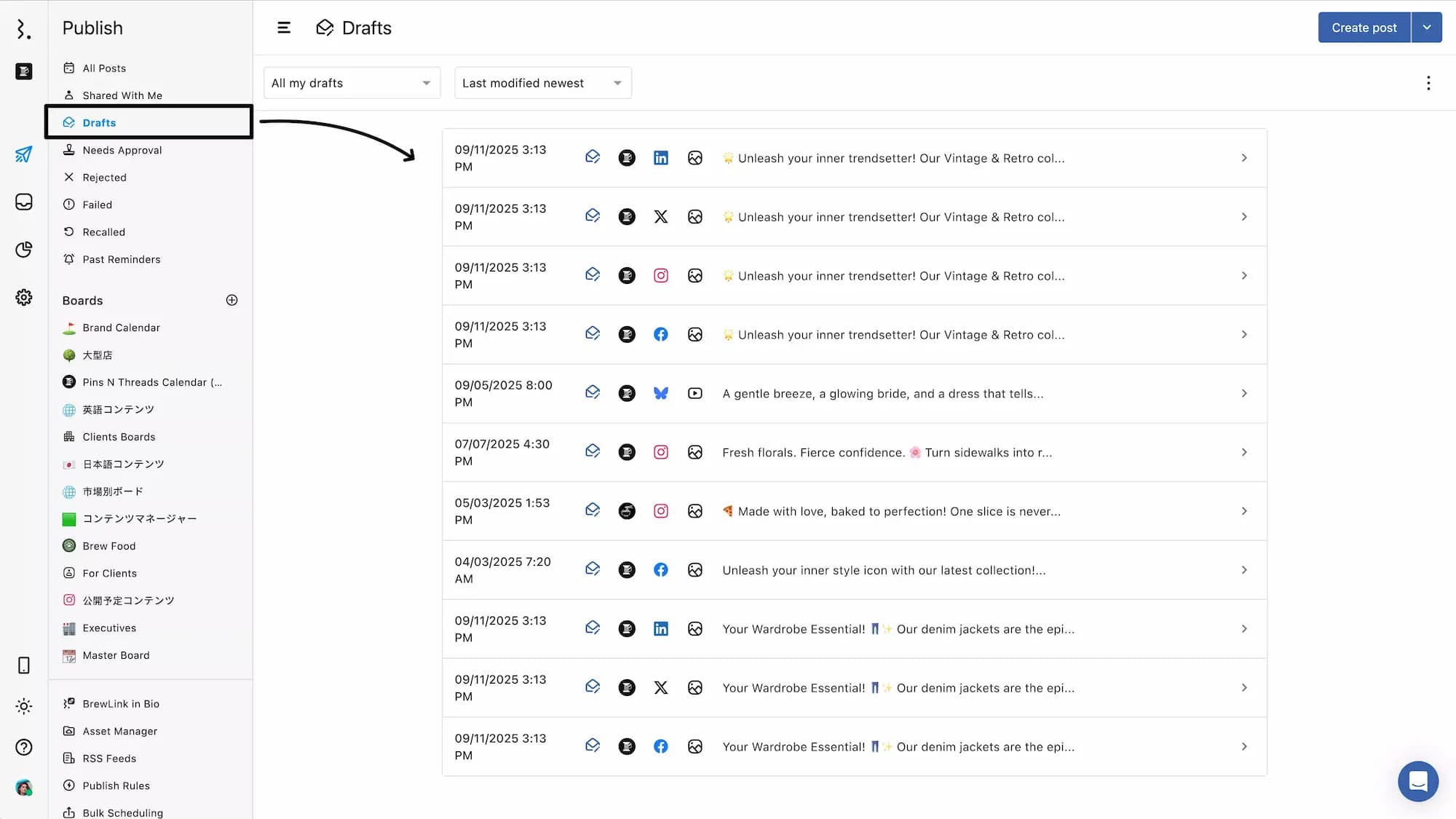 下書き保存した投稿は、 プランナー > 下書きで確認できます。