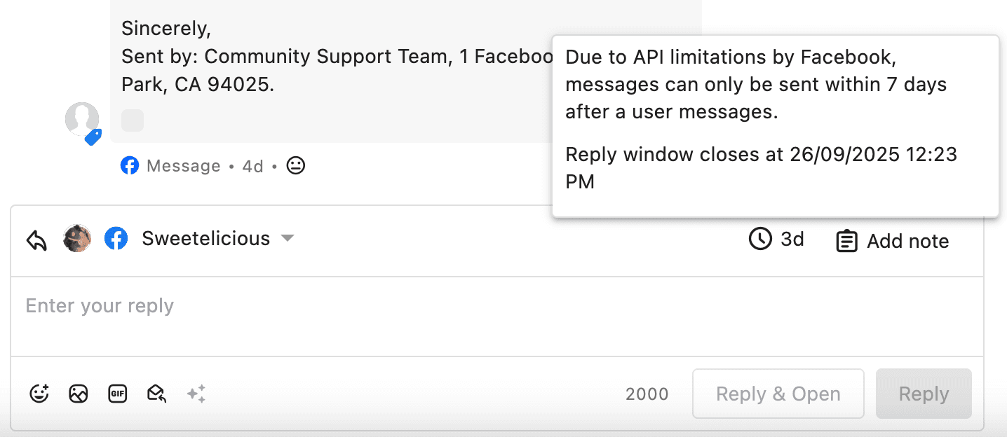 プライベートな返信にはテキストのみが可能です。メディア(画像/動画/GIF)は、FacebookのAPI制限により本文とは別のメッセージとみなされてしまうため、追加できません。