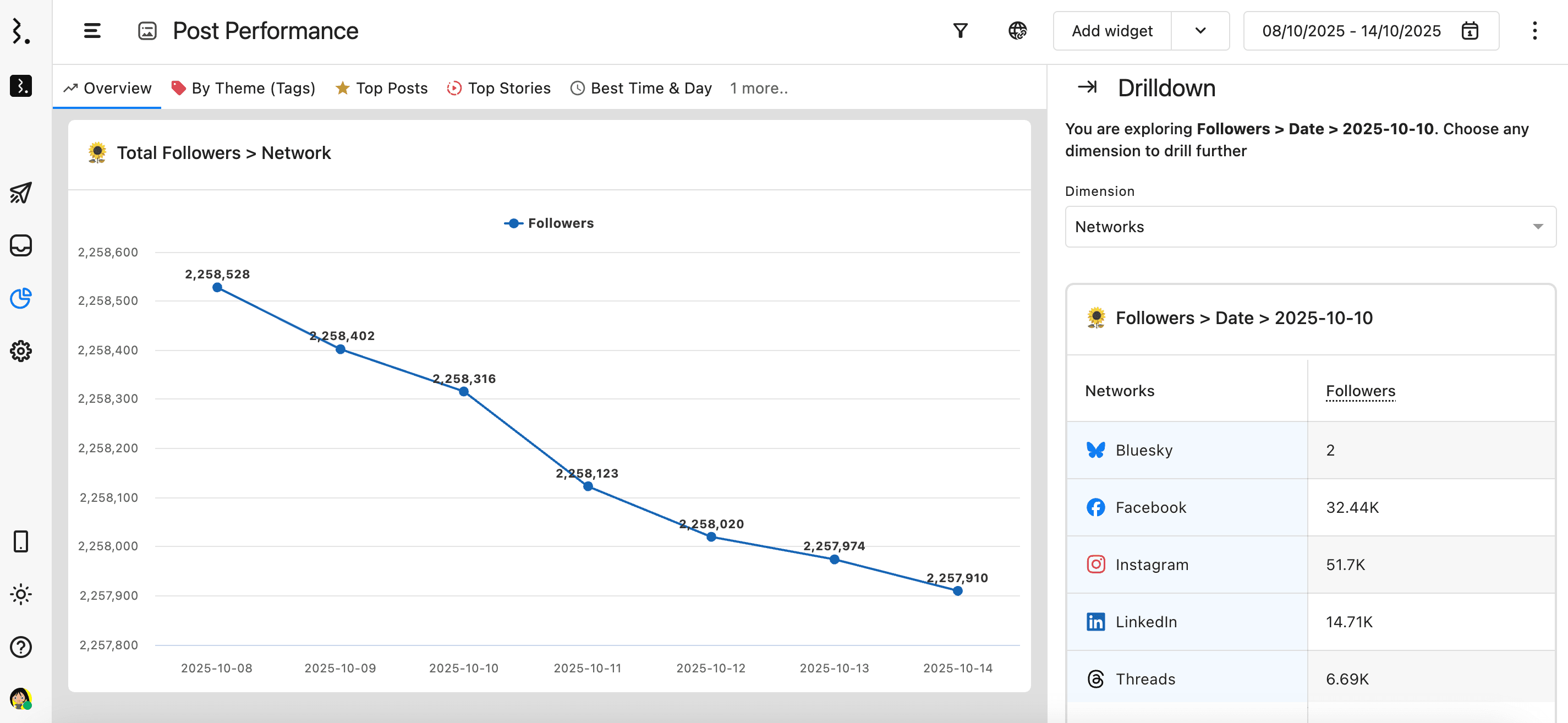 日付別にドリルダウンし、オーディエンスの増加が最も高かった時期を割り出し、特定のキャンペーン、投稿、イベントとの関係を分析できます。何がオーディエンスの増加を促しているのか、明確に把握することができます。