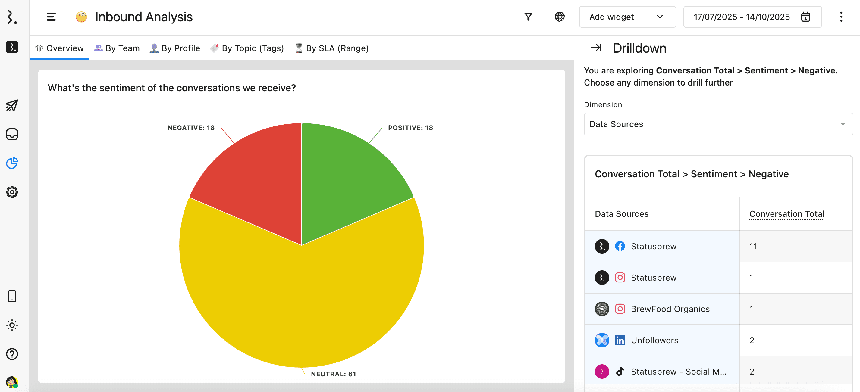 データソースや日付などのディメンションを選択してドリルダウンすることで、どのプラットフォームから、あるいはいつ、最もネガティブな反応が見られたのかを素早く確認します。チームで問題に迅速に対処し、コミュニケーション戦略を最適化できます。