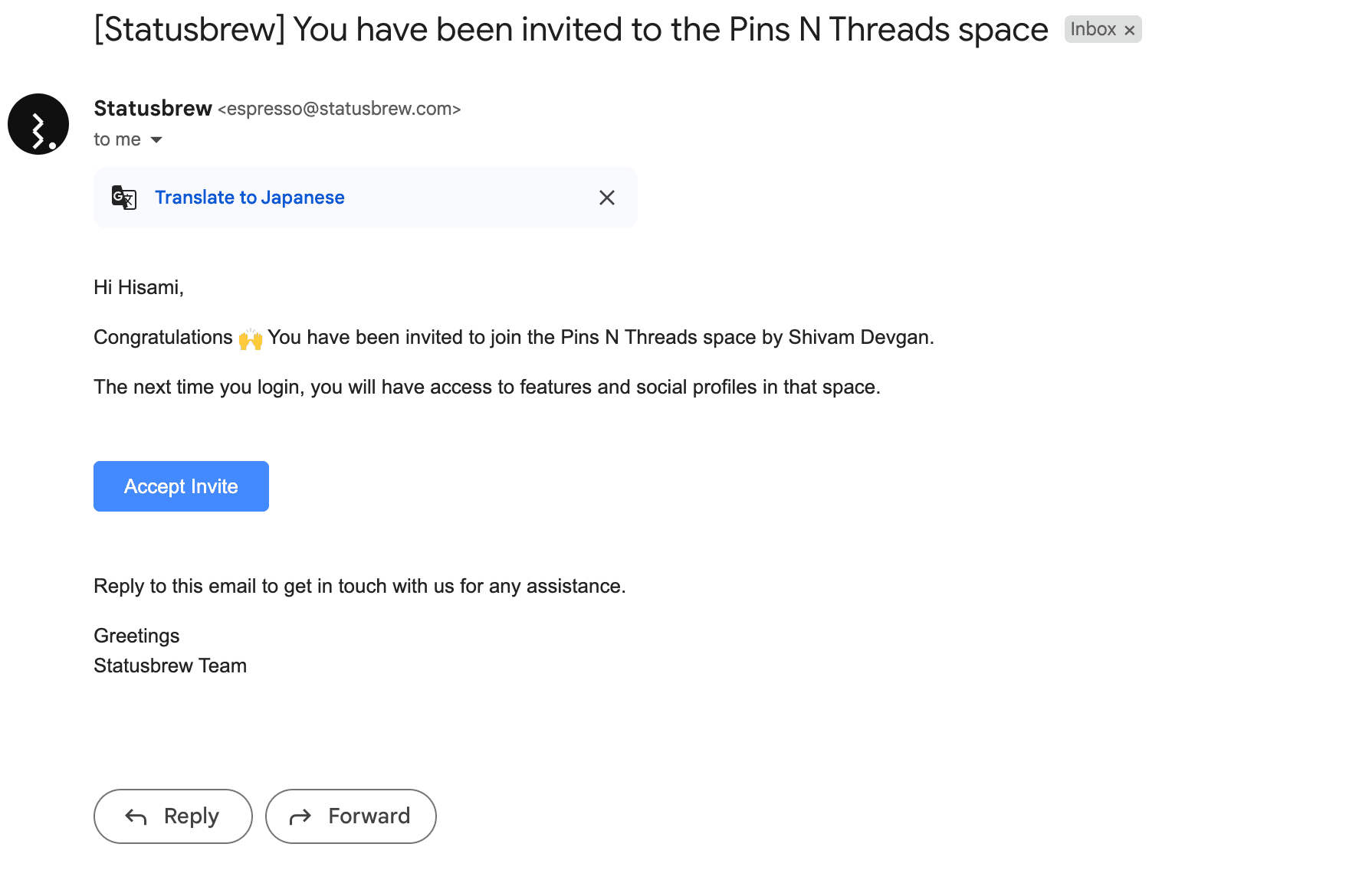 Statusbrewプラットフォームへチームから招待されると、通常下記のような招待メールが届きますが、招待期間中にログインできなかった場合の対処法について解説します。
