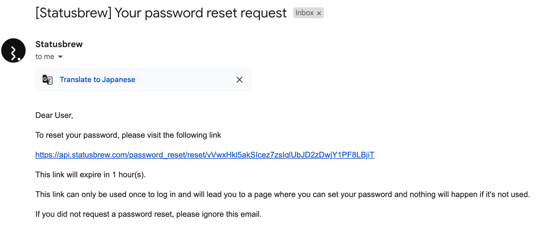 2. パスワードリセットと再設定のためのリカバリーメールが届きます。届かない場合、迷惑メールを確認いただくかメールタイトル [Statusbrew] Your password reset request にて受信箱を検索ください。