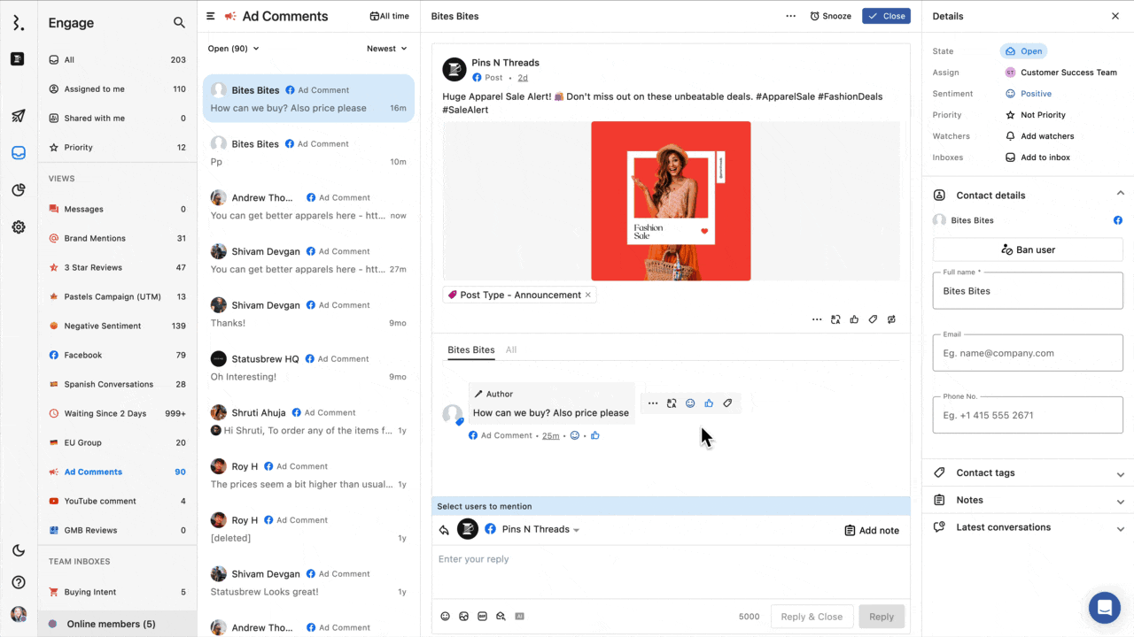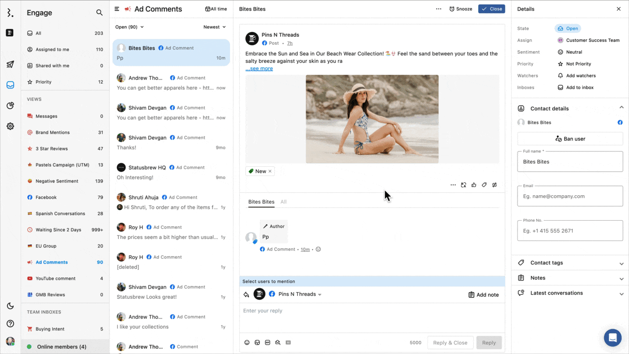 Facebookの広告コメントへの返信は、顧客エンゲージメントの維持、そして問い合わせ対応のために大切な要素です。Statusbrewではエンゲージ機能によって、中央にある1つのプラットフォームから、複数のFacebook広告アカウントを管理し、返信することが可能です。