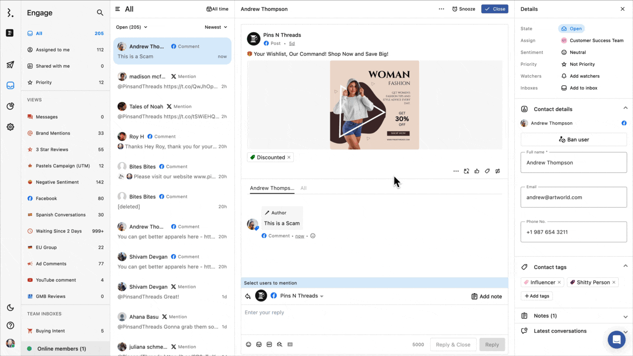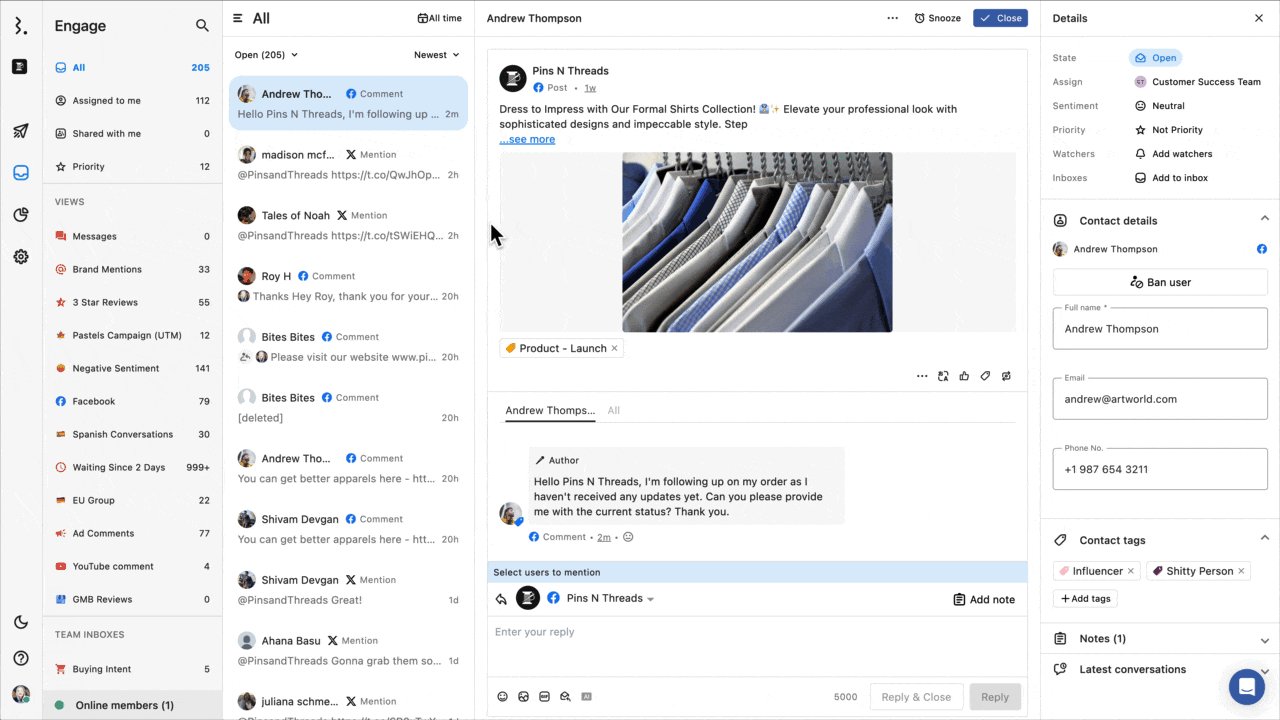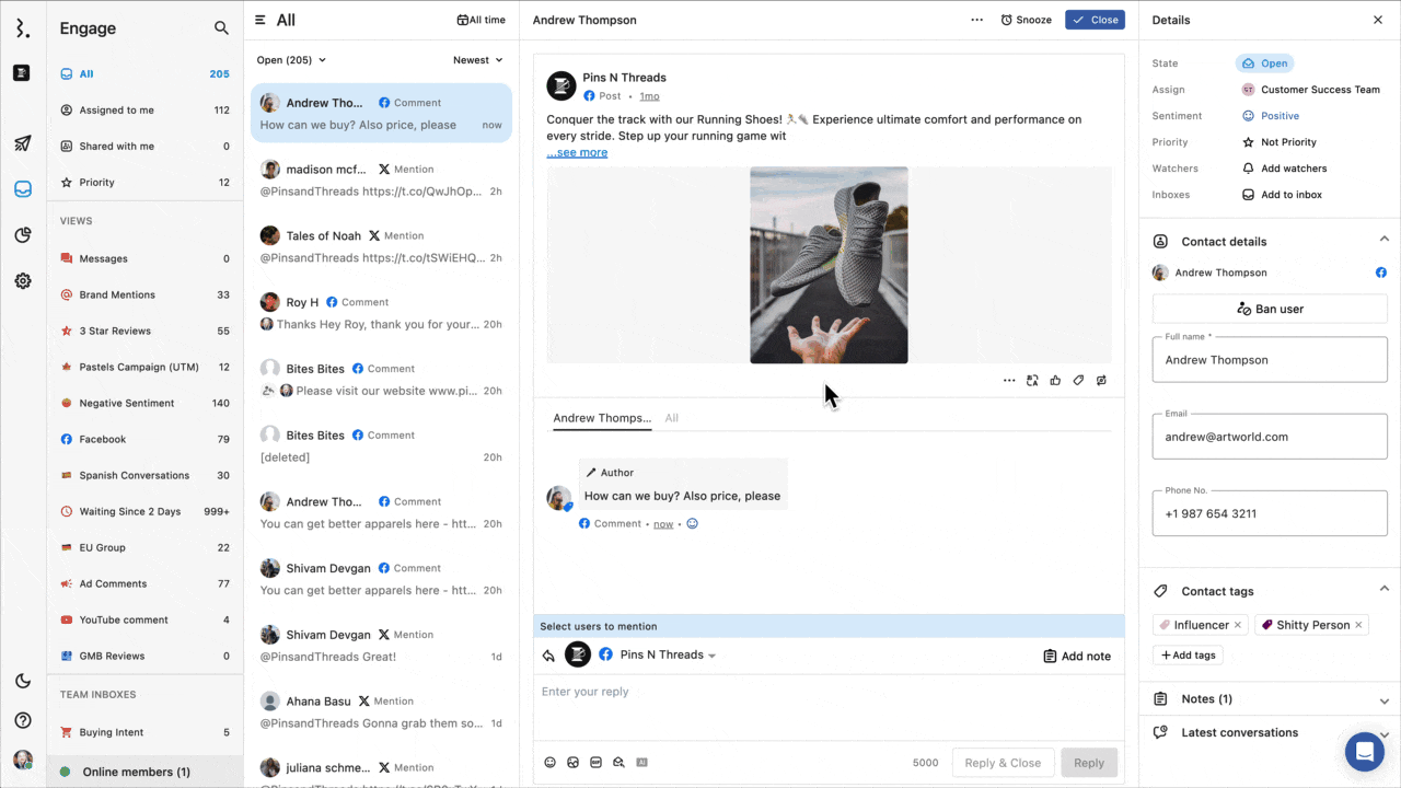 返信したいFacebookコメントを開きます。チーム受信箱、あるいはエンゲージビューを確認すると素早くコメントを見つけることができます。