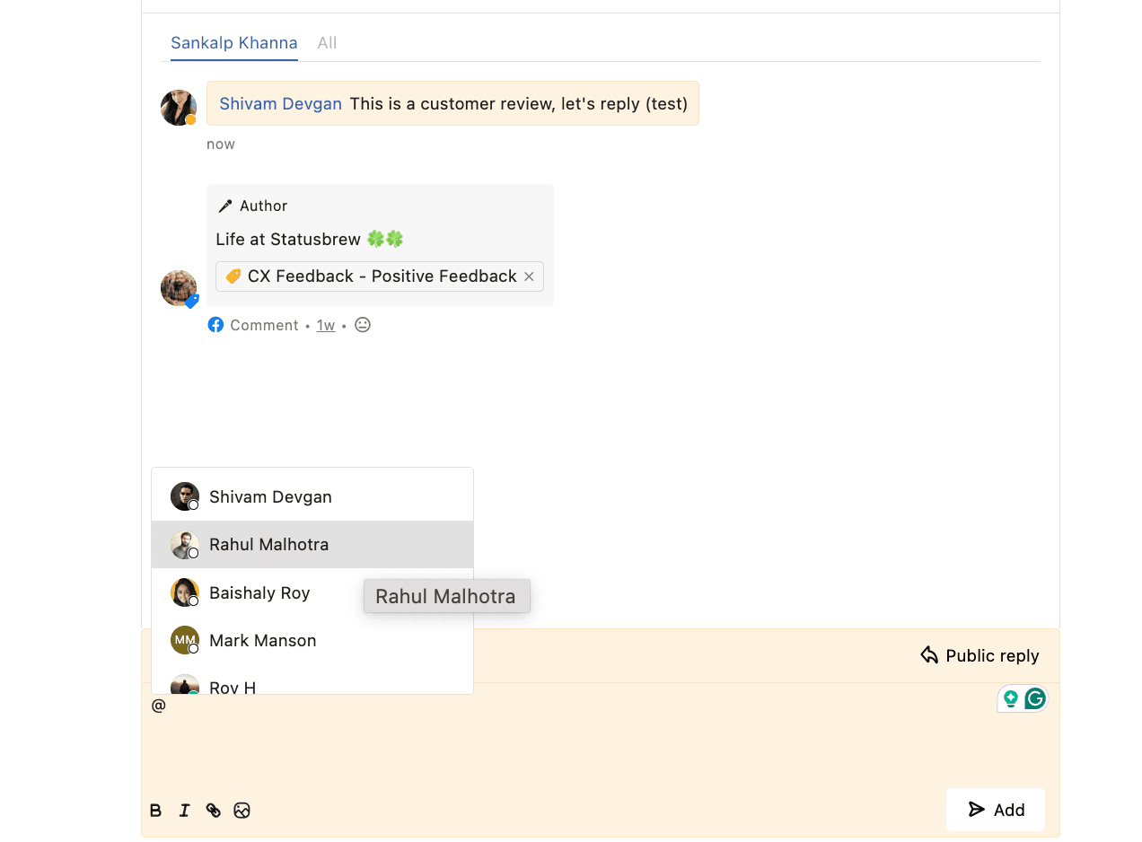 Statusbrewでは、コメントやDM、メンションなどの"会話"をチケット化してチームでメッセージ管理を行うことができます。Facebookのコメントやメンションなどのチケットも受信箱で一元管理し、そこから返信を行うことも可能です。