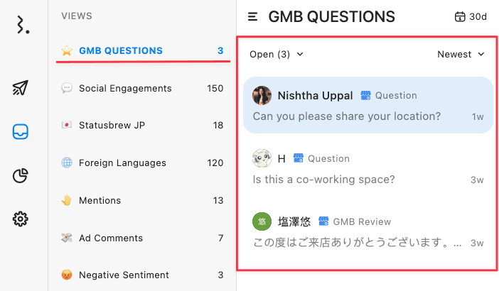 Statusbrewでは、エンゲージの受信箱を通して全てのリスティングでGoogle My Businessの質問のサポートを提供しています。各質問の通知を受け取り、各質問の通知をリアルタイムで受け取り、 エンゲージ受信箱からブランド認証済みの回答を直接配信しましょう。