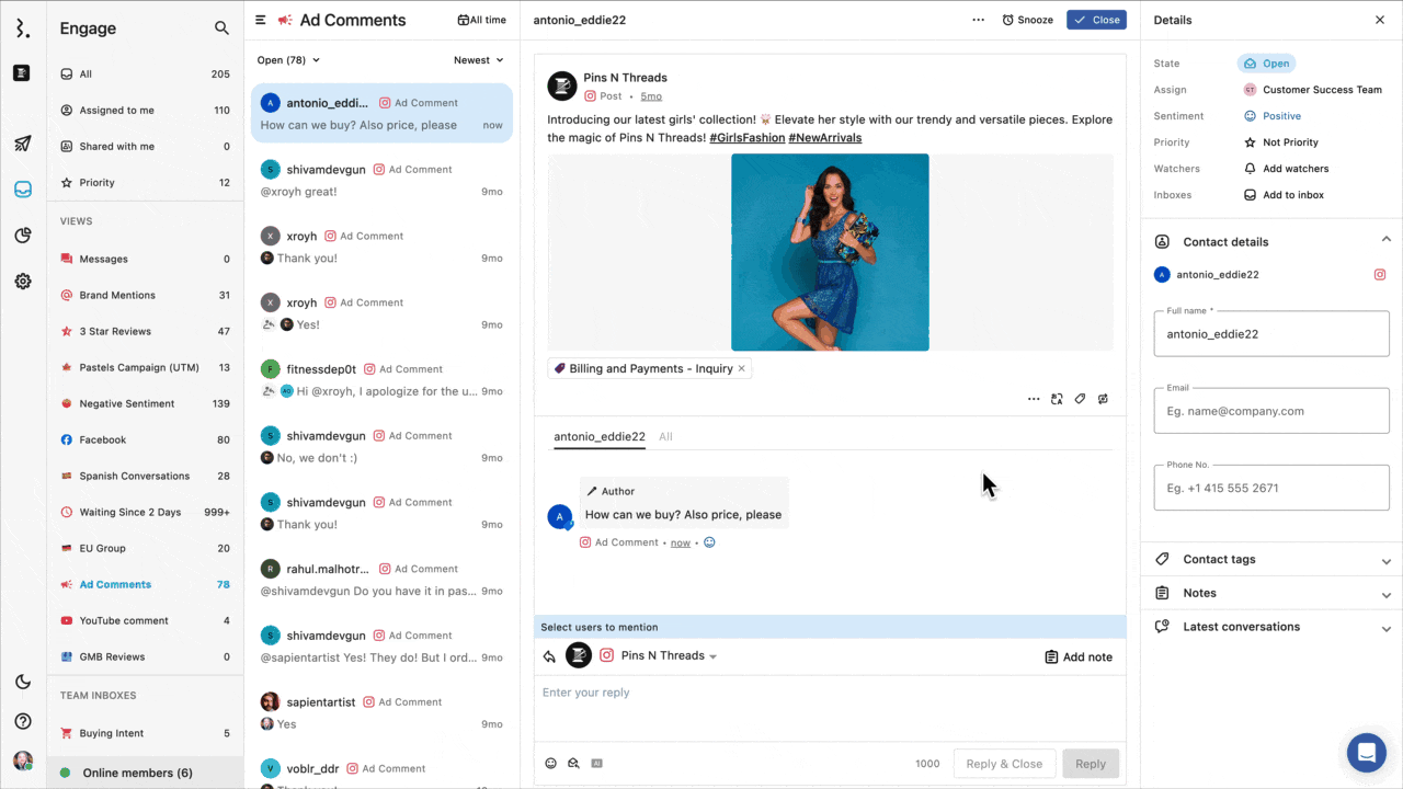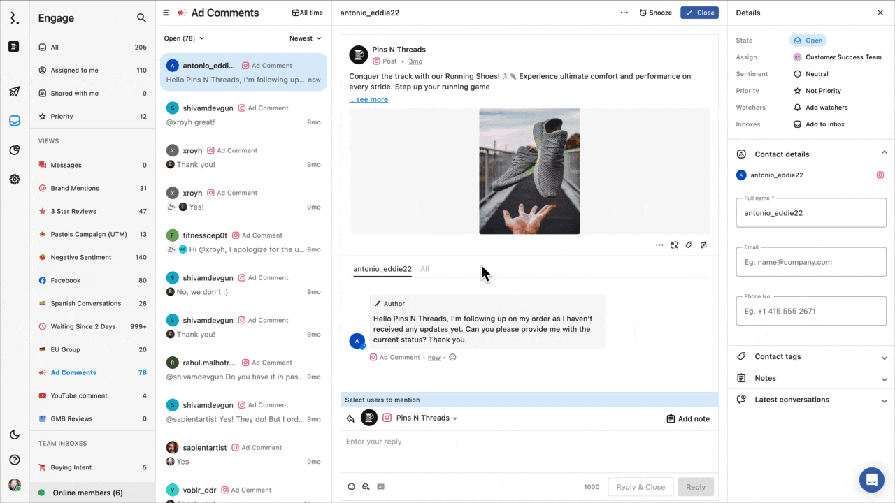 返信したいInstagramの広告コメントを開きます。チーム受信箱またはエンゲージビューで確認すると早く見つけることができるでしょう。