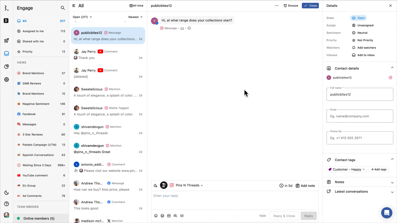 返信したいInstagramのメッセージを開きます。メッセージを素早く見つけるには、チーム受信箱またはエンゲージ受信箱のビューを活用しましょう。