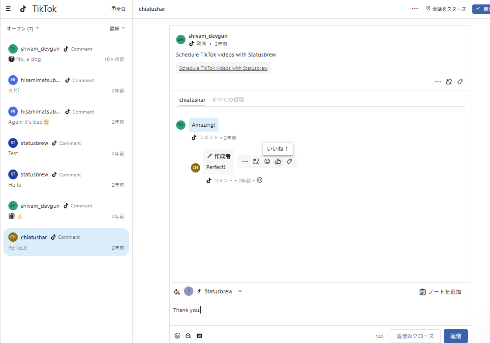 Statusbrewでは、TikTokのコメント、メンション、DMを管理するための様々なエンゲージメント機能を提供しています。