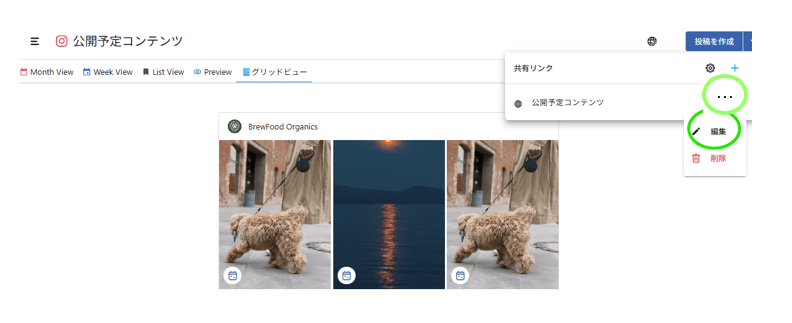 グリッドビューでも他の表示形式と同じく、各画像をクリックすると、その投稿の詳細画面が表示されます。また、左下のアイコンは予約済み、投稿済み、下書きなどのステータスを表しています。