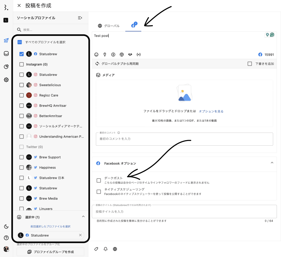 Facebookオプションで、「ダークポスト」にチェックをいれます。