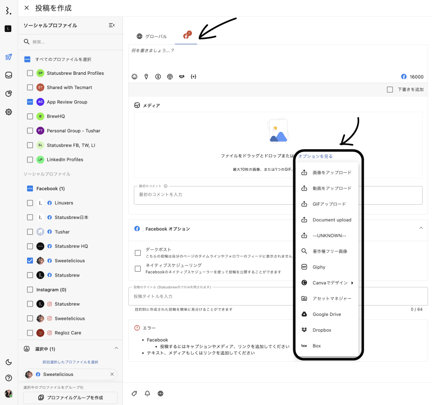 キャプションを追加します(最大16,000文字)。※キャプションの入力時、StatusbrewのAIアシスタント機能であるBrew AIを活用することも可能です。