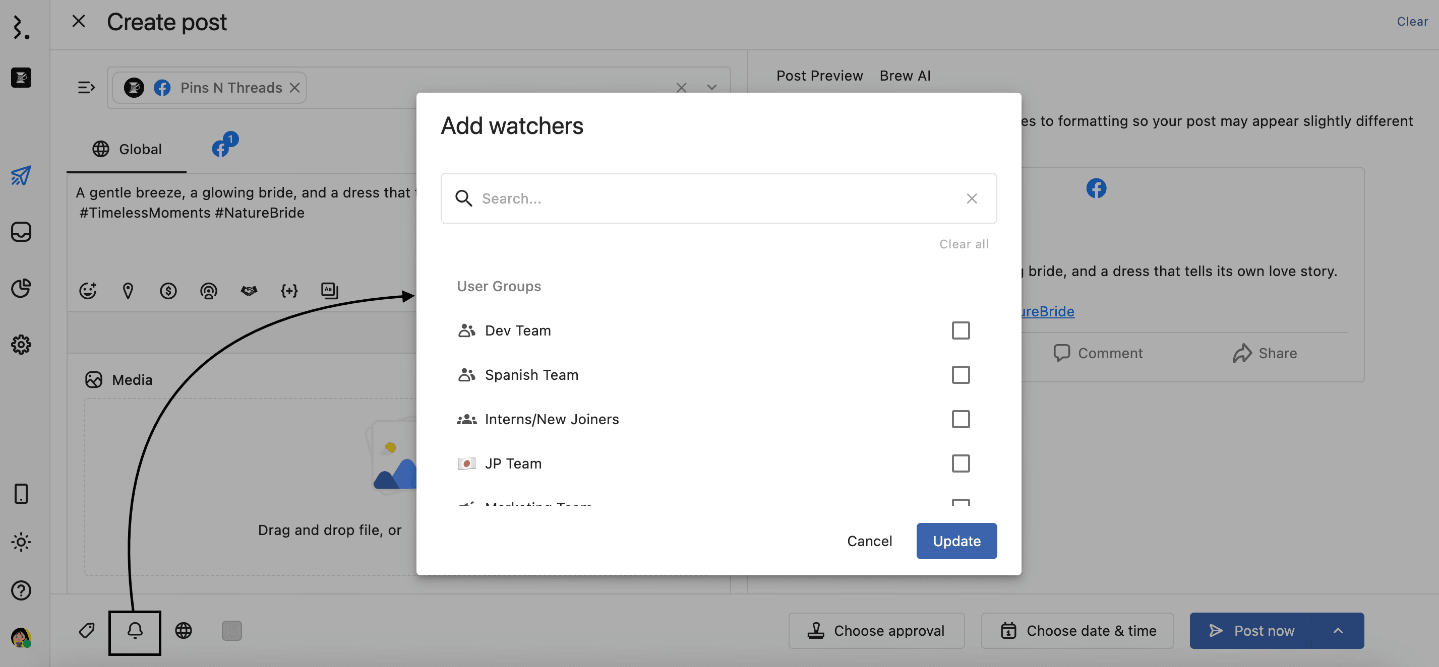 承認申請:投稿を承認者に共有し、コンテンツの質やコンプライアンスに準拠しているかの確認をしてもらうよう申請します
