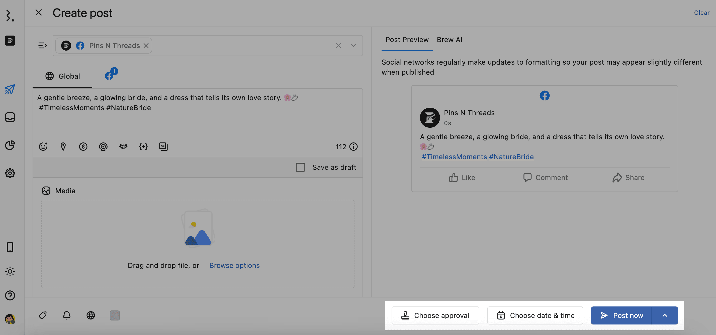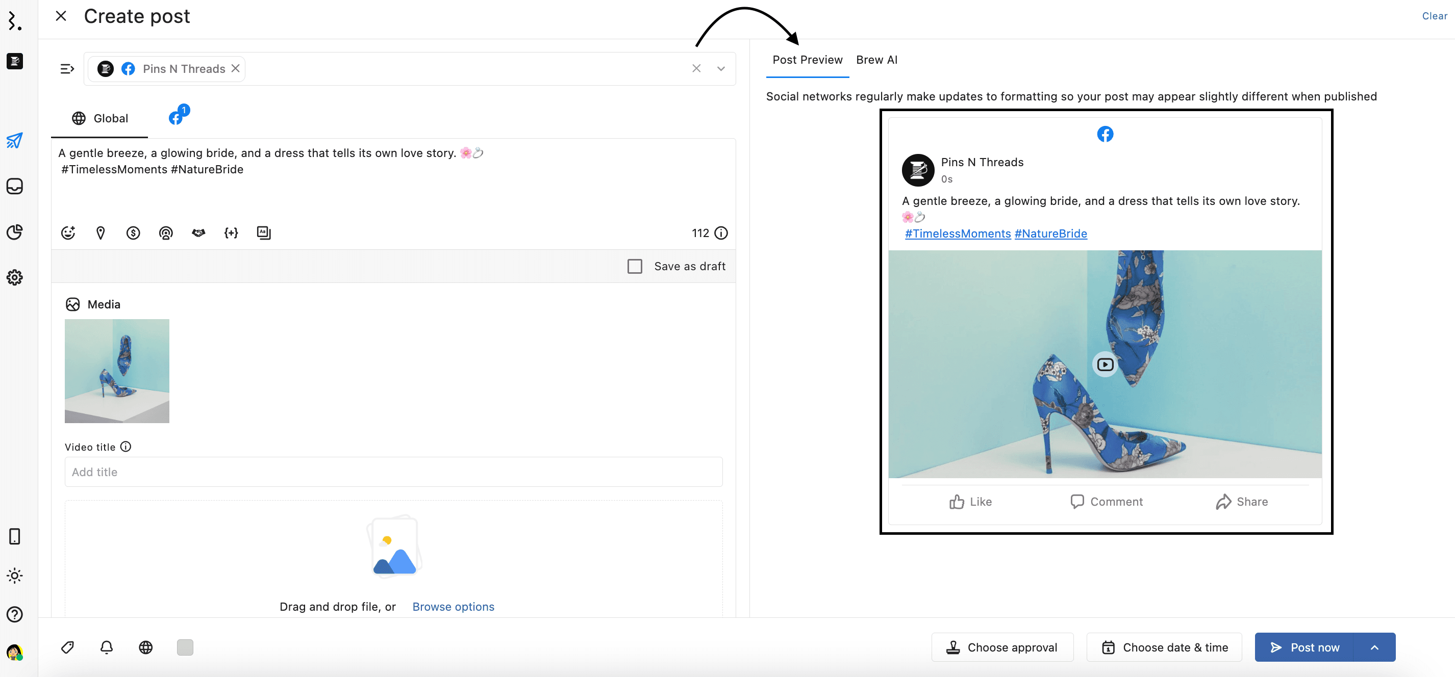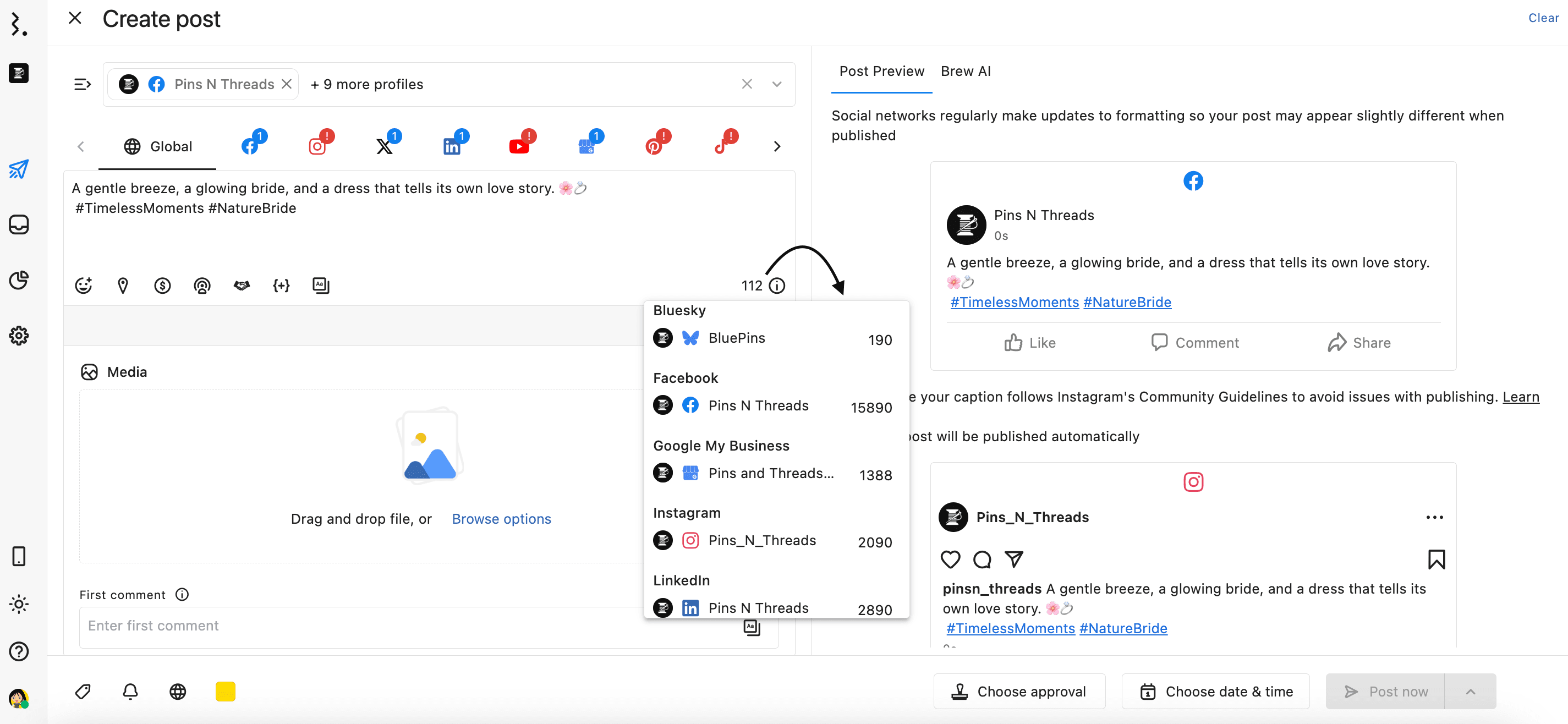 投稿の作成中は、右側のプレビューでプラットフォームごとに投稿がどのように見えるのか表示されます。公開前に投稿を整えるのに便利です。