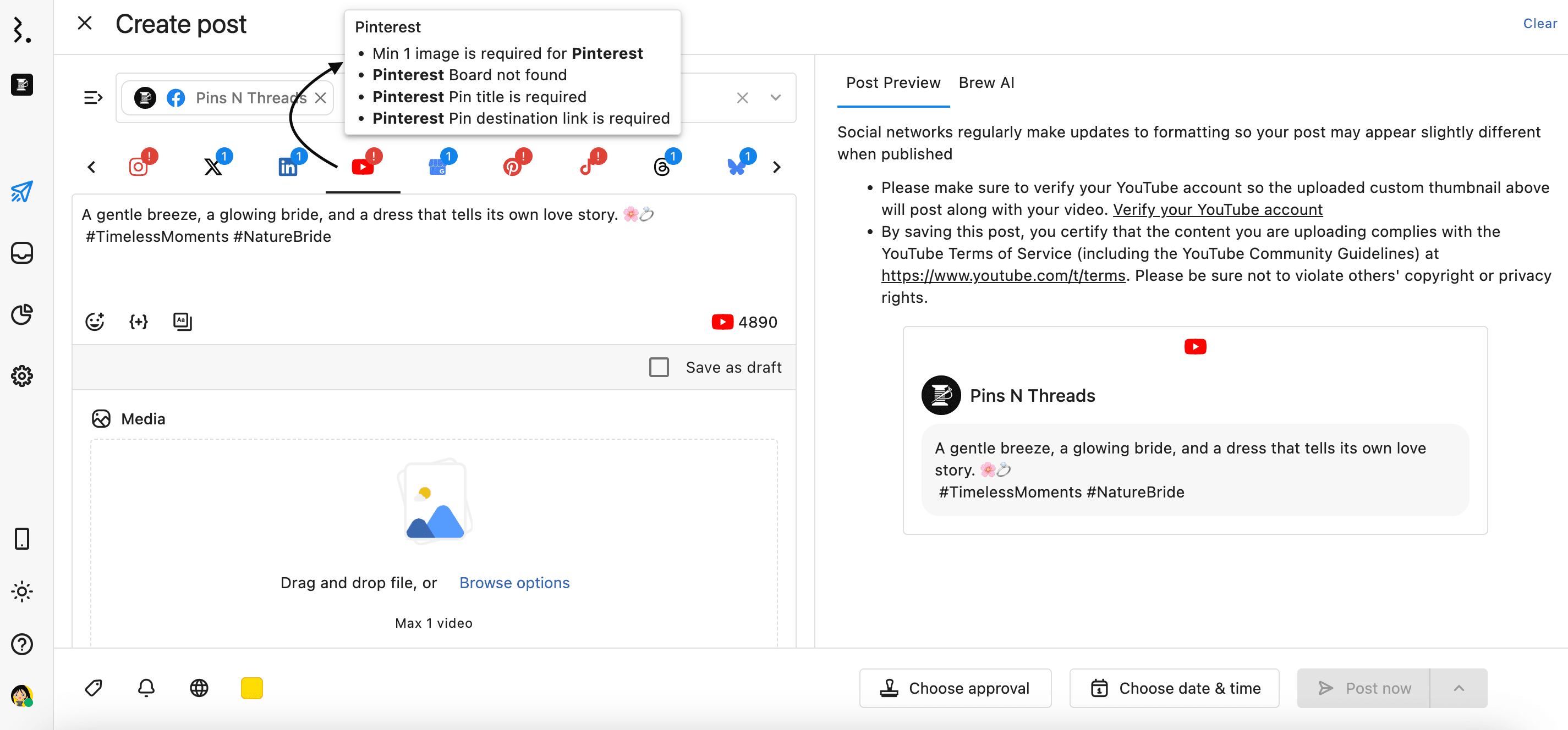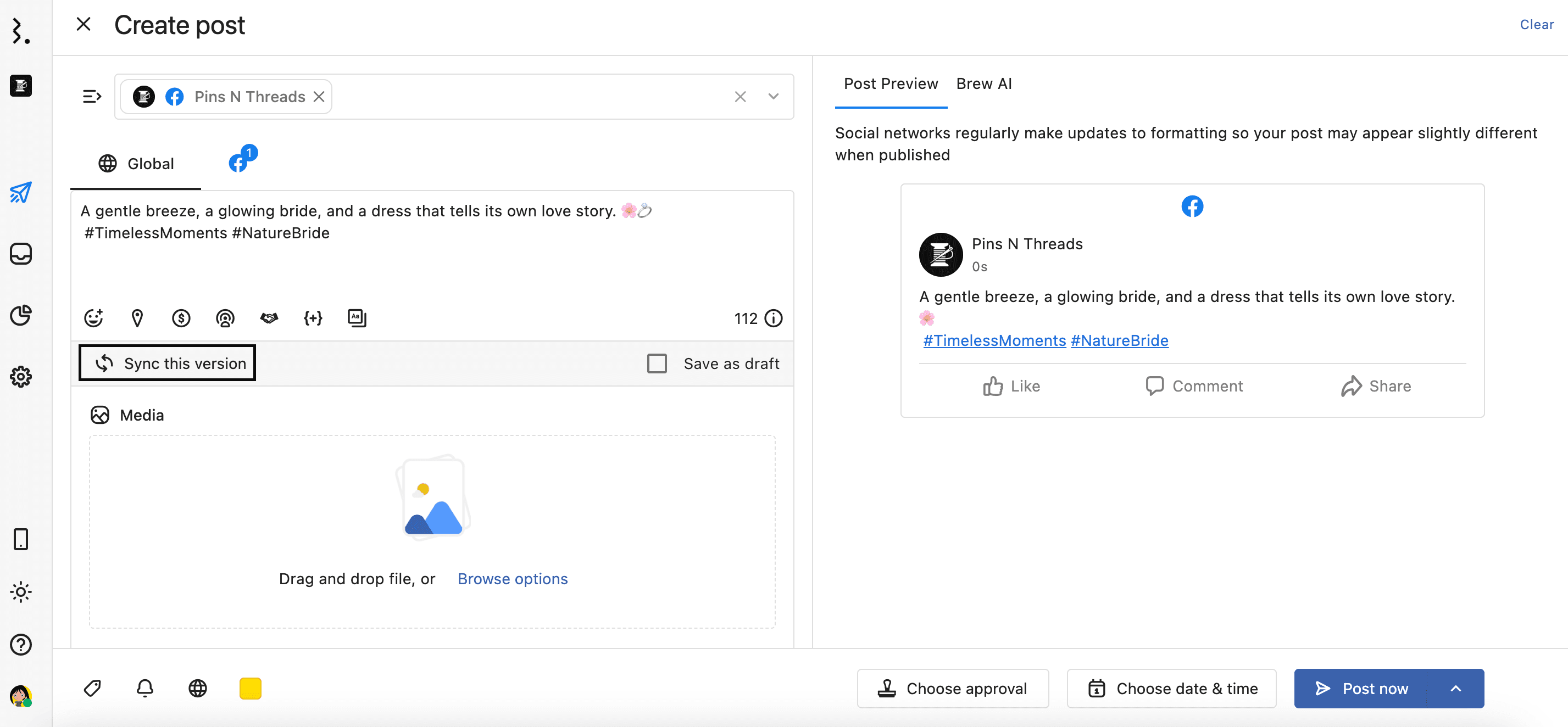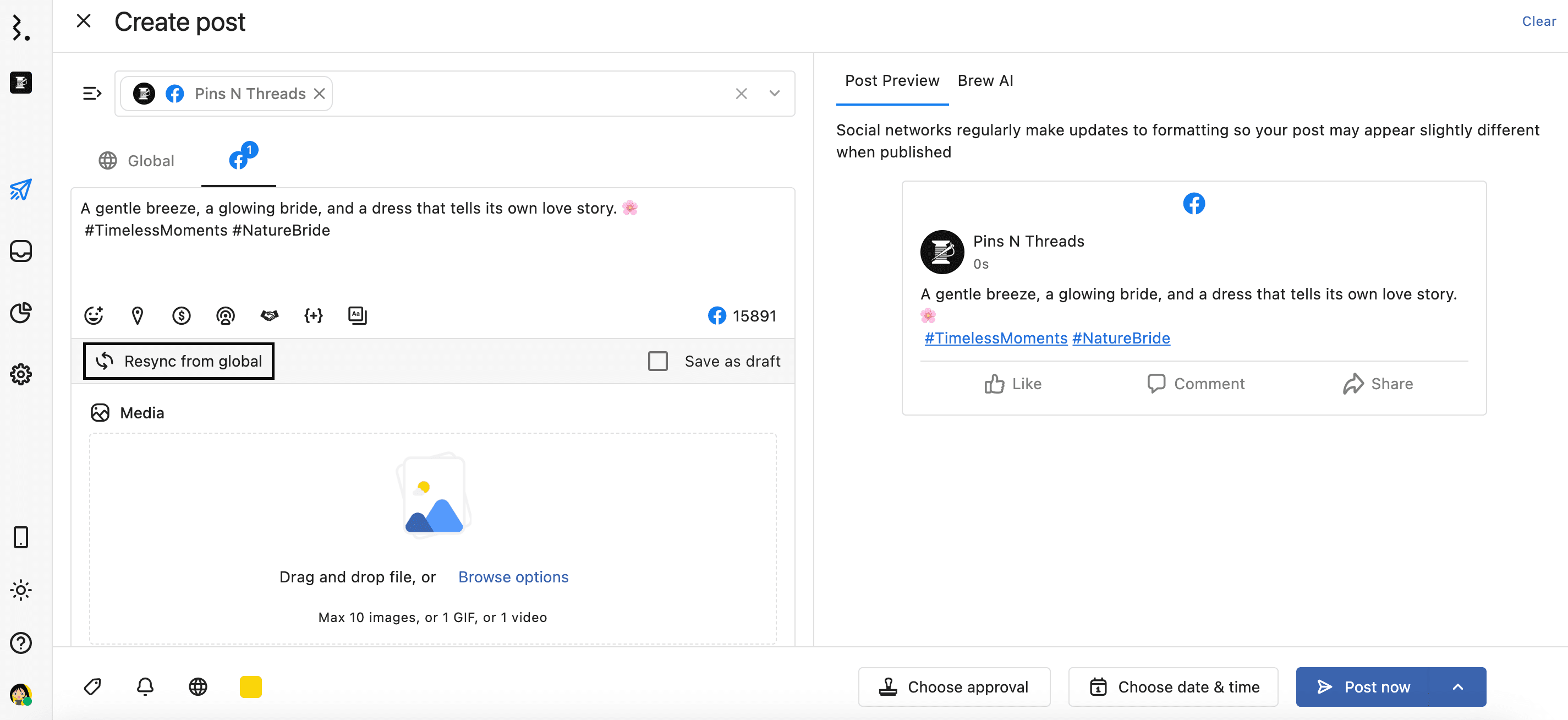 Statusbrewでは、複数のSNSに一括して投稿を作成し、それぞれの投稿のカスタマイズが可能です。 コンポーズではテキストやハッシュタグ、メディアを調整して、投稿を各プラットフォームに最適化できます。