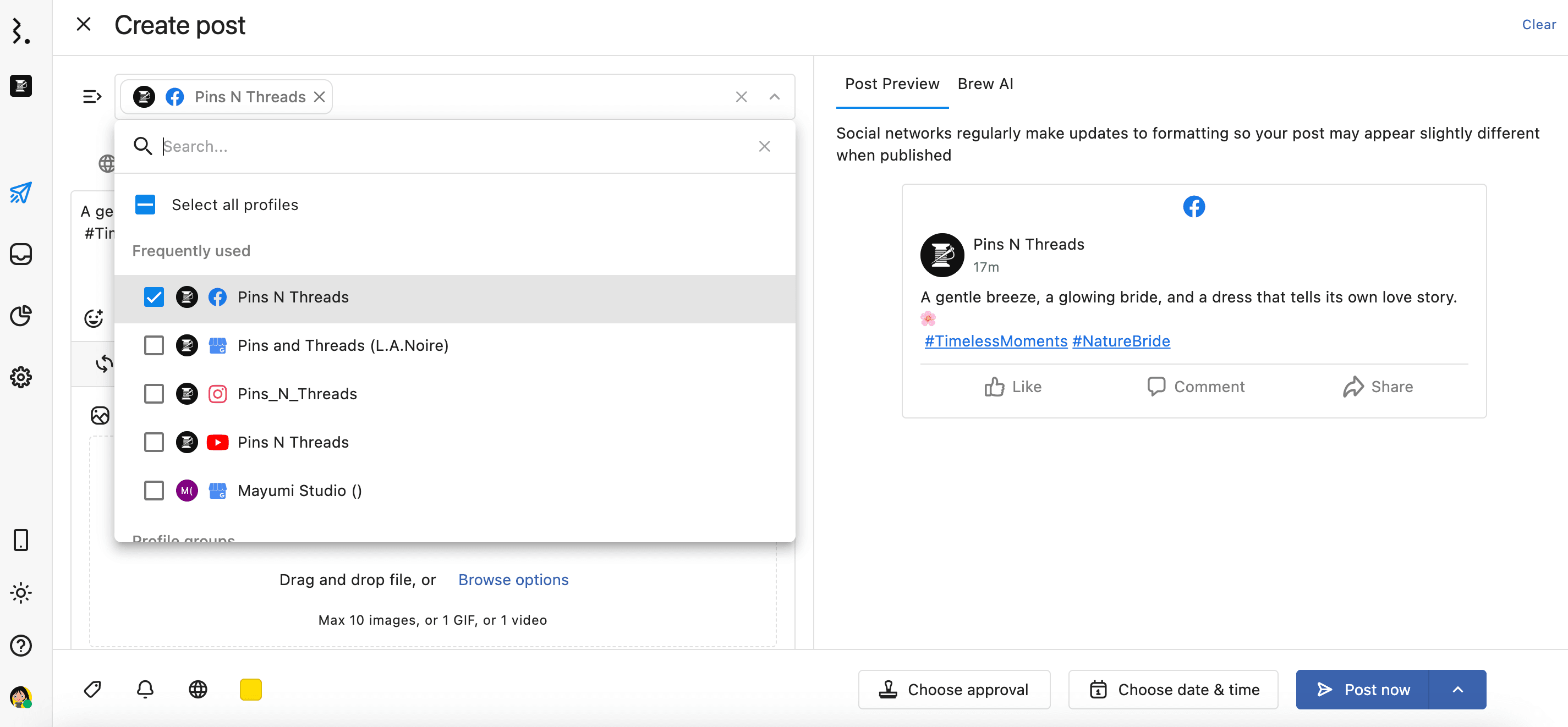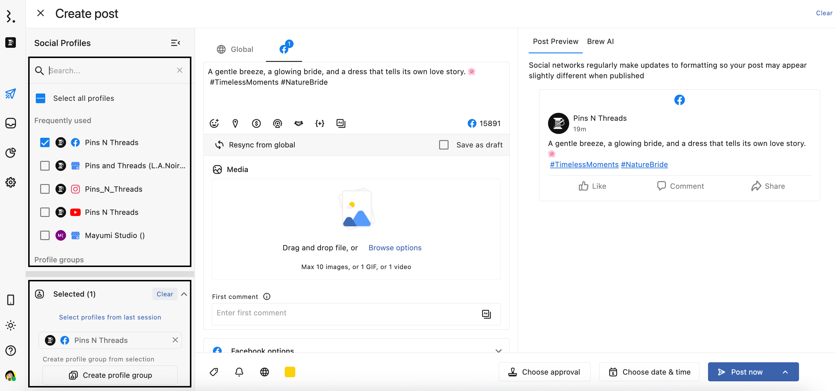 プロファイルピッカーより、投稿先となる1つ以上のプロファイルまたはプロファイルグループを選択します。