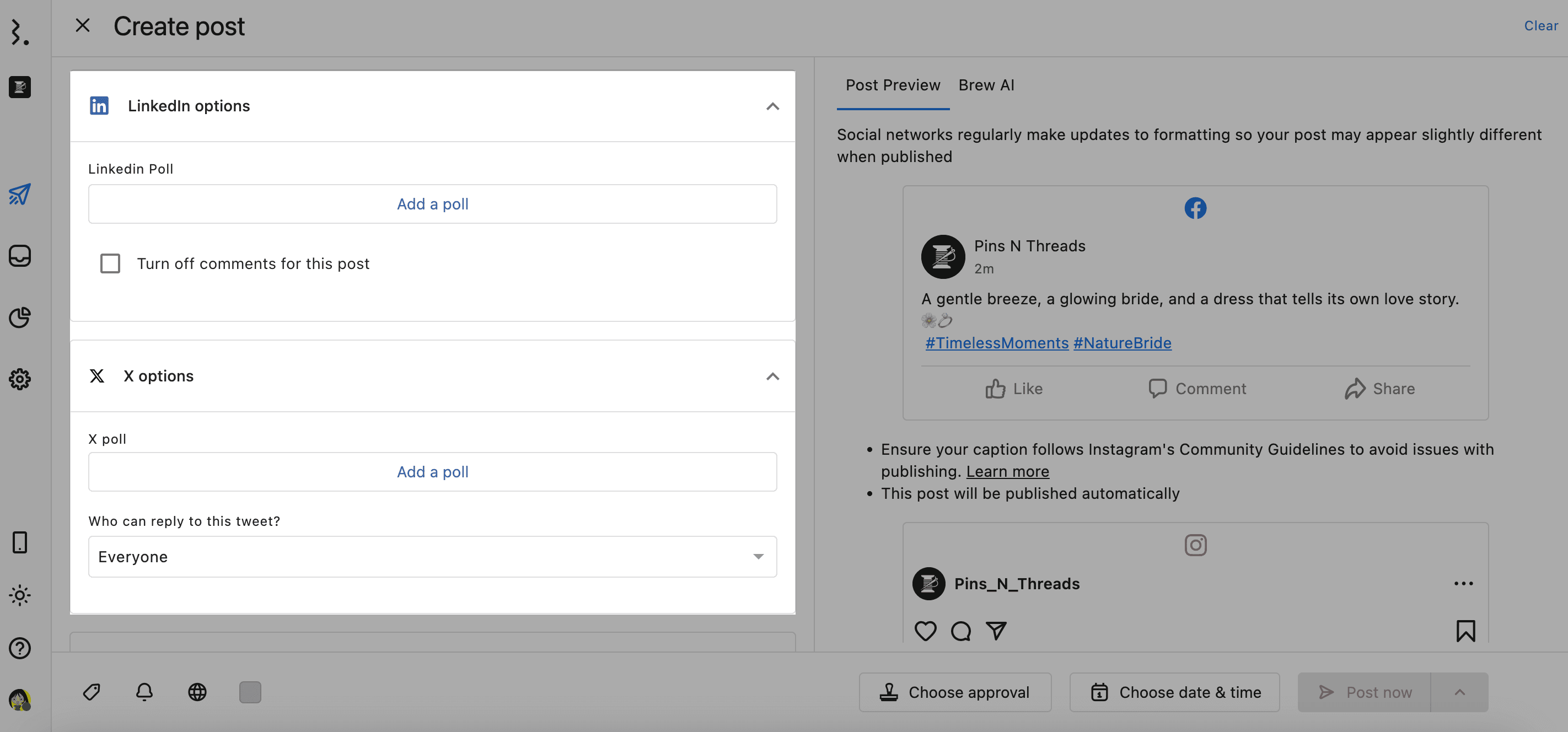 各SNS固有の機能を活用するため、ネットワーク固有のオプションを投稿に適用することができます。 Facebookのダークポスト、 LinkedInアンケート、Xの投票機能などです。