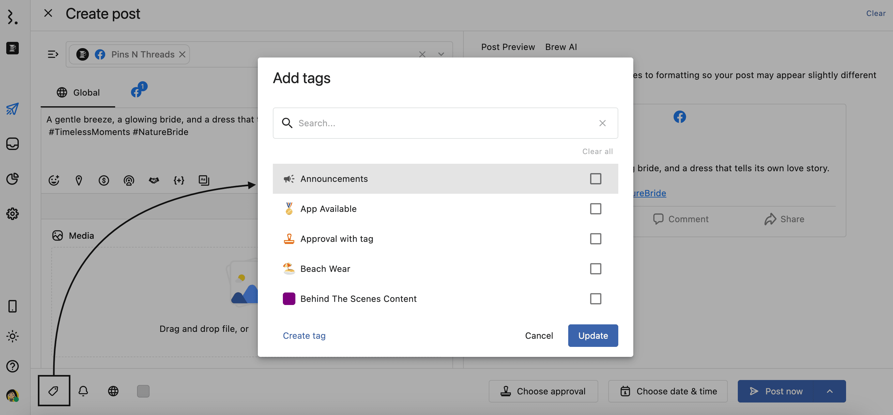 キャンペーンやトピック、コンテンツタイプなどStatusbrewで作成したタグを投稿につけ、投稿を整理整頓できます。
