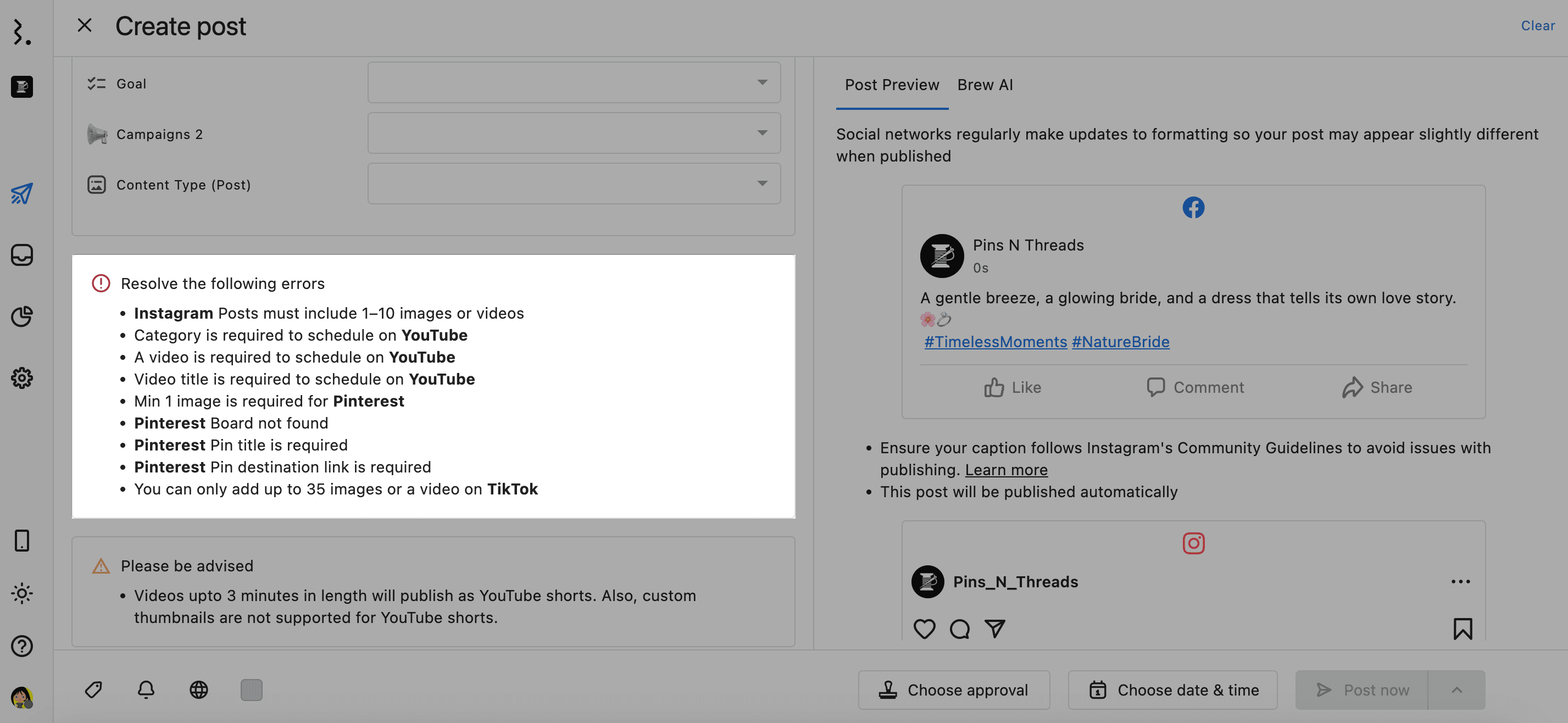投稿に要件を満たしていないことがある場合は、ネットワークごとにエラーメッセージが表示されます。それらのエラーは投稿、予約投稿、承認申請前に解決する必要があります。