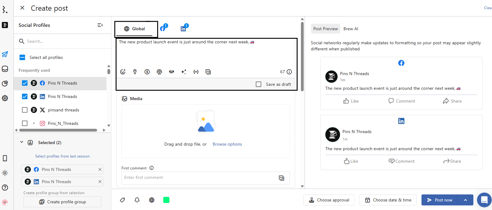 コンポーズでは、デスクトップからもモバイルからでも、Statusbrewに接続しているソーシャルプロファイルの投稿の下書き、編集、予約投稿が可能です。