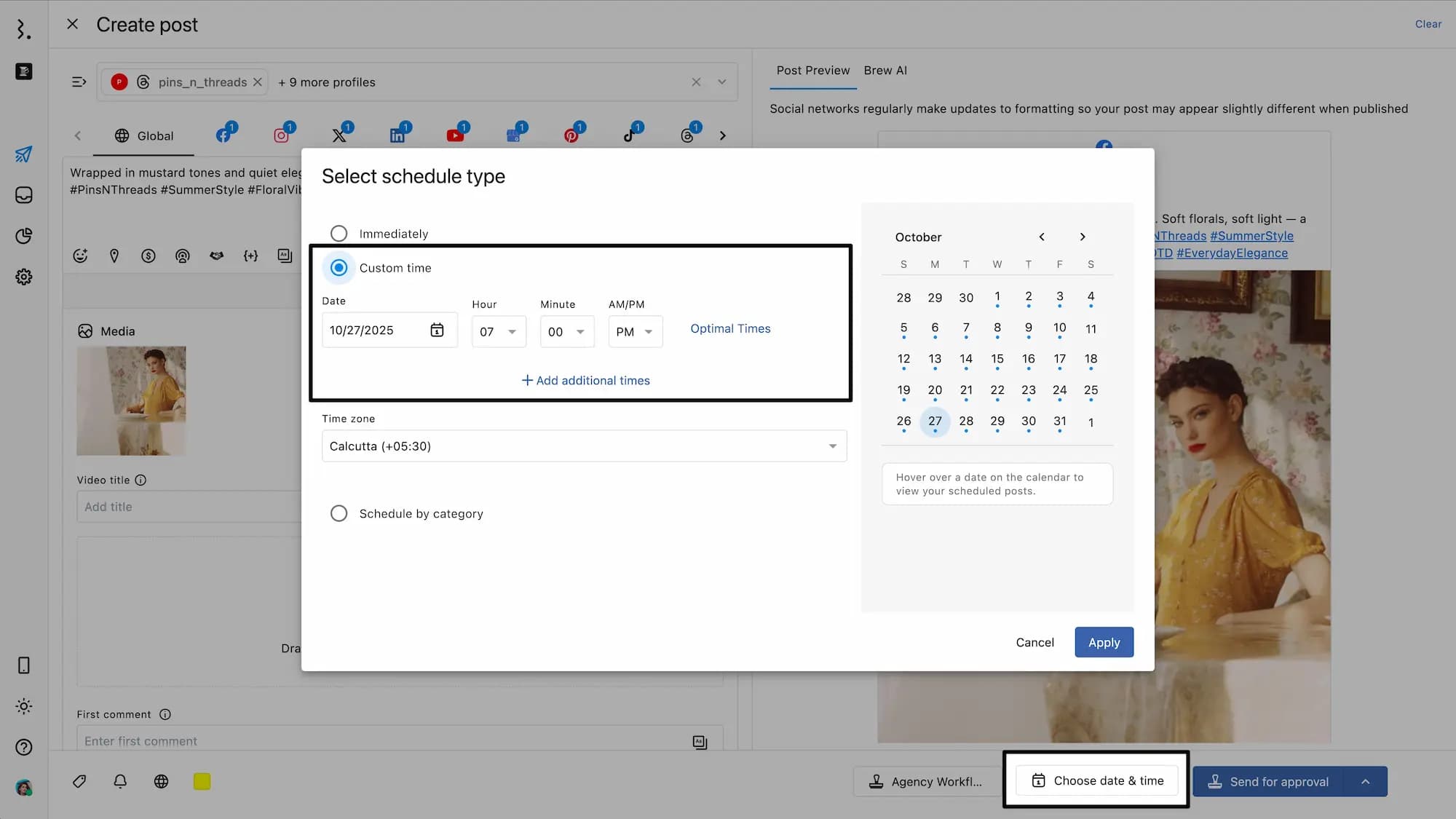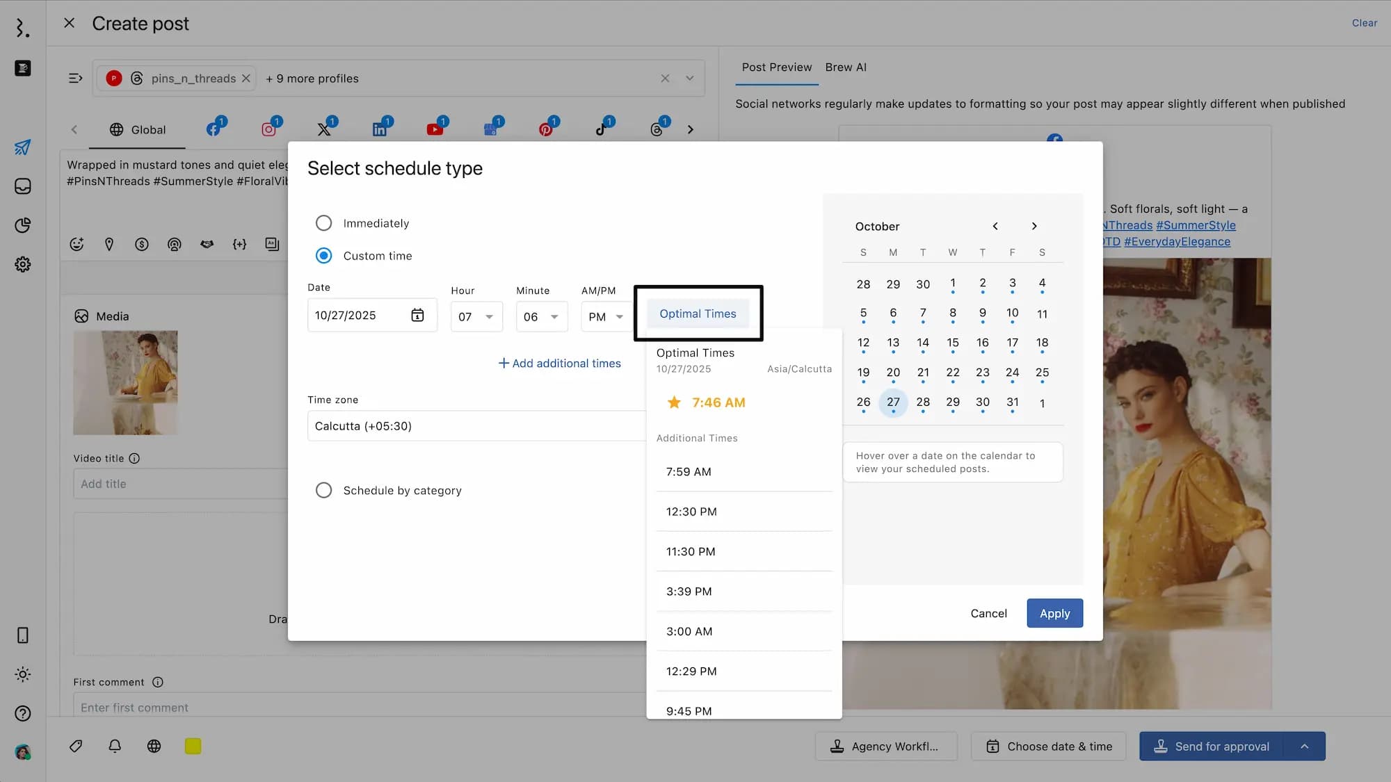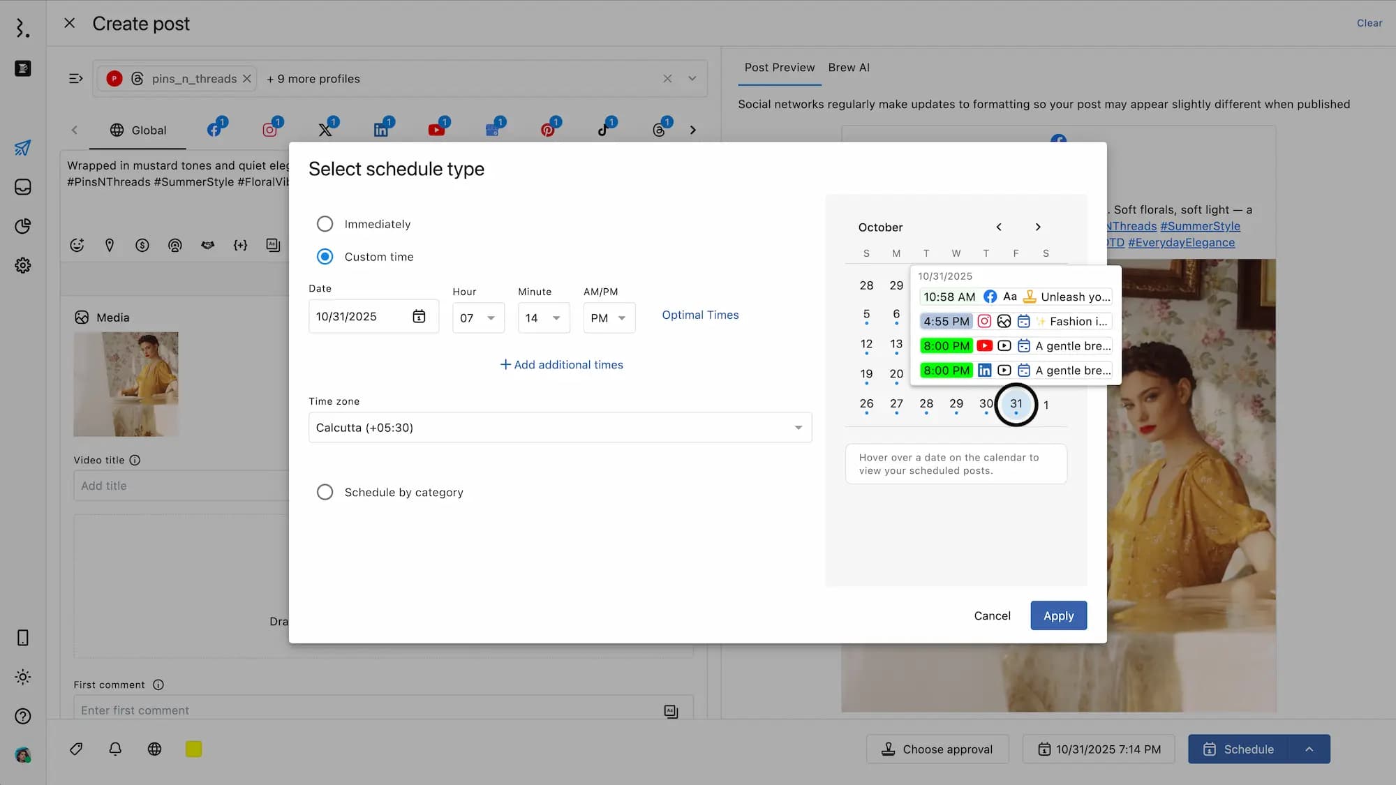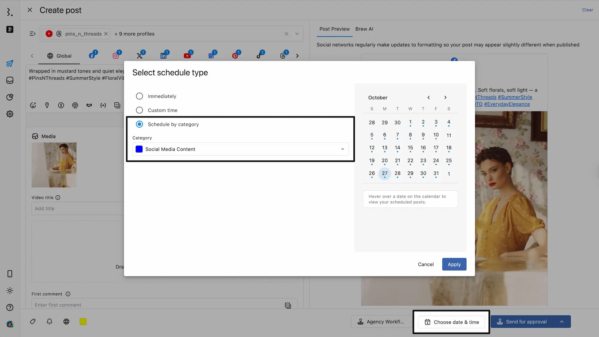 Statusbrewでは、複数のプラットフォームにおけるソーシャルメディアの投稿を予約できます。特定の時間やカテゴリーを選択して、効果的なコンテンツ配信を実現します。
