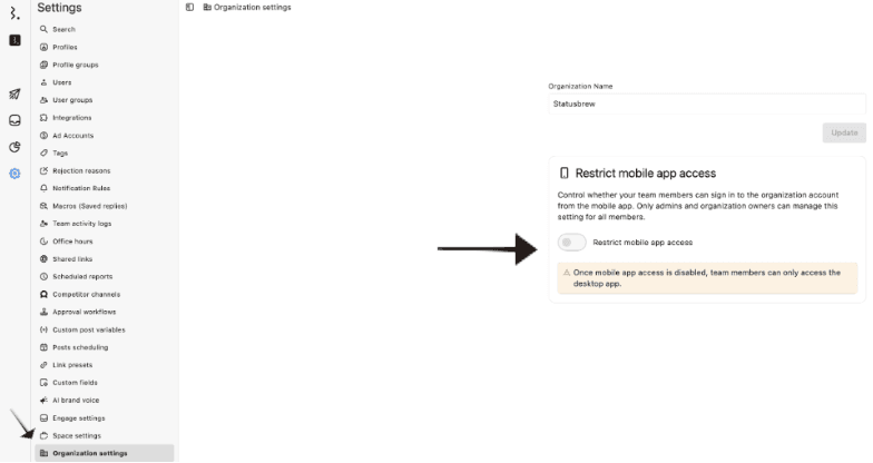 ですが、SNS運用ルールを設けている組織によっては、モバイルアプリからではなくデスクトップ版で操作することが望ましい場合もあるでしょう。Statusbrewではそんな皆様の声にお応えして、モバイルアプリへのアクセスを制御するオプションを追加しました。