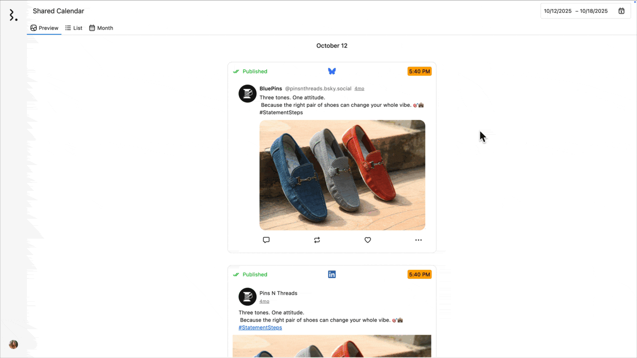 Statusbrewの共有リンクは、月間ビュー、週間ビュー、リストビュー、プレビューのカレンダーを、あなたの組織外の関係者と共有することが可能です。