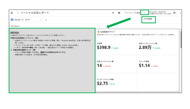 社内やクライアント向けのフィードバックメモ(共有ノート):画面上部の「ウィジェットを追加」の右にあるをクリックしてメモを追加し、社内外の関係者と情報共有が可能です。