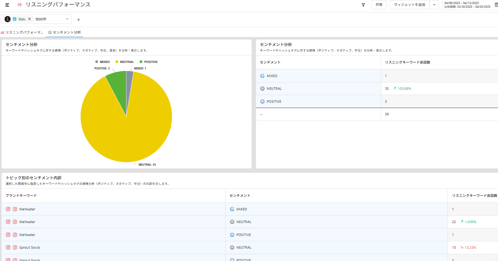 キーワードやハッシュタグに対する各センチメントを分析するセクションです。ポジティブな反応が集まる商品のキャンペーンを企画したり、人気がないメニューを再検討したりと、今後の計画に役立ちます。