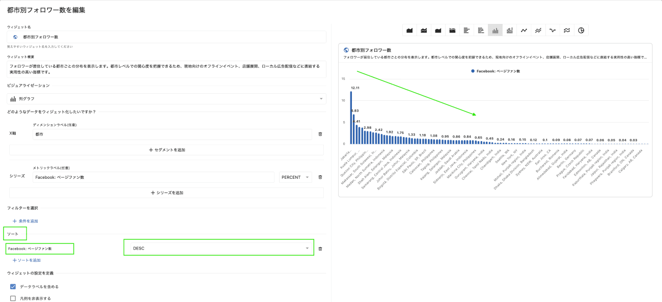 また、1つのウィジェットに複数の指標が含まれている場合は、最も重視する指標を選んで、並び替えることをお勧めします。(ソートで複数の指標を選択して、降順/昇順を指定することも可能ではありますが、複数のソートが混在すると、値が散らばって表示され、分析に有効なレポートとはなりません。)