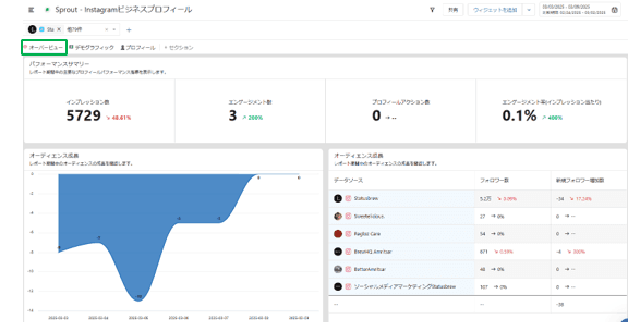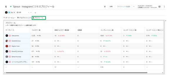 レポート期間中に集計された各メトリクス(フォロワー数、新規フォロワー増加数、エンゲージメント数など)を、データソース別に一覧(テーブル)で確認することができるセクションです。